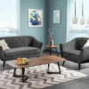 Sofa 2-osobowa, tapicerka: tkanina aksamit, stelaż: drewno, kolor: szary / wenge. Wymiary sofy: A – 83, B – 160, C – 43, D – 56, E – 85, F – 18 cm.