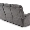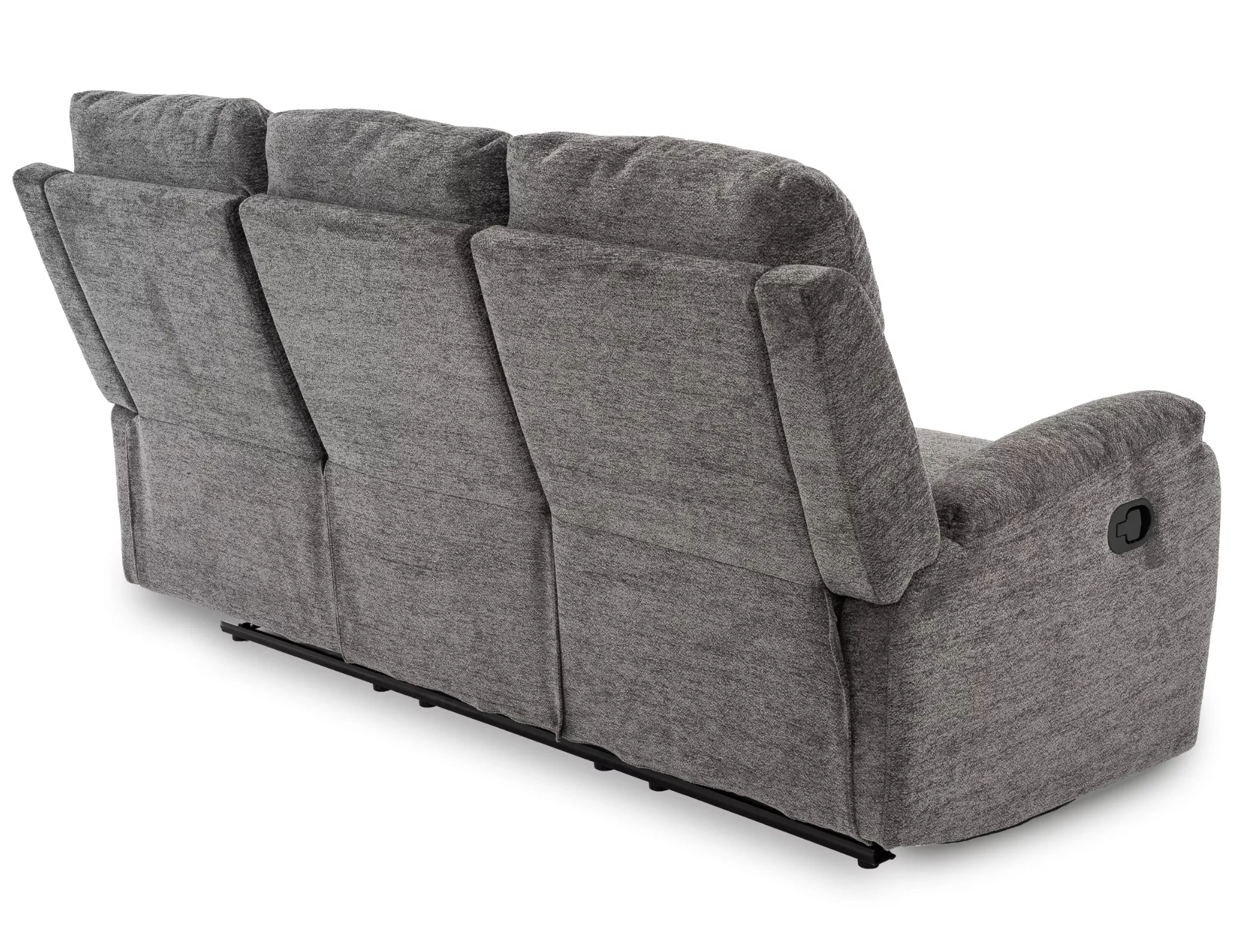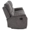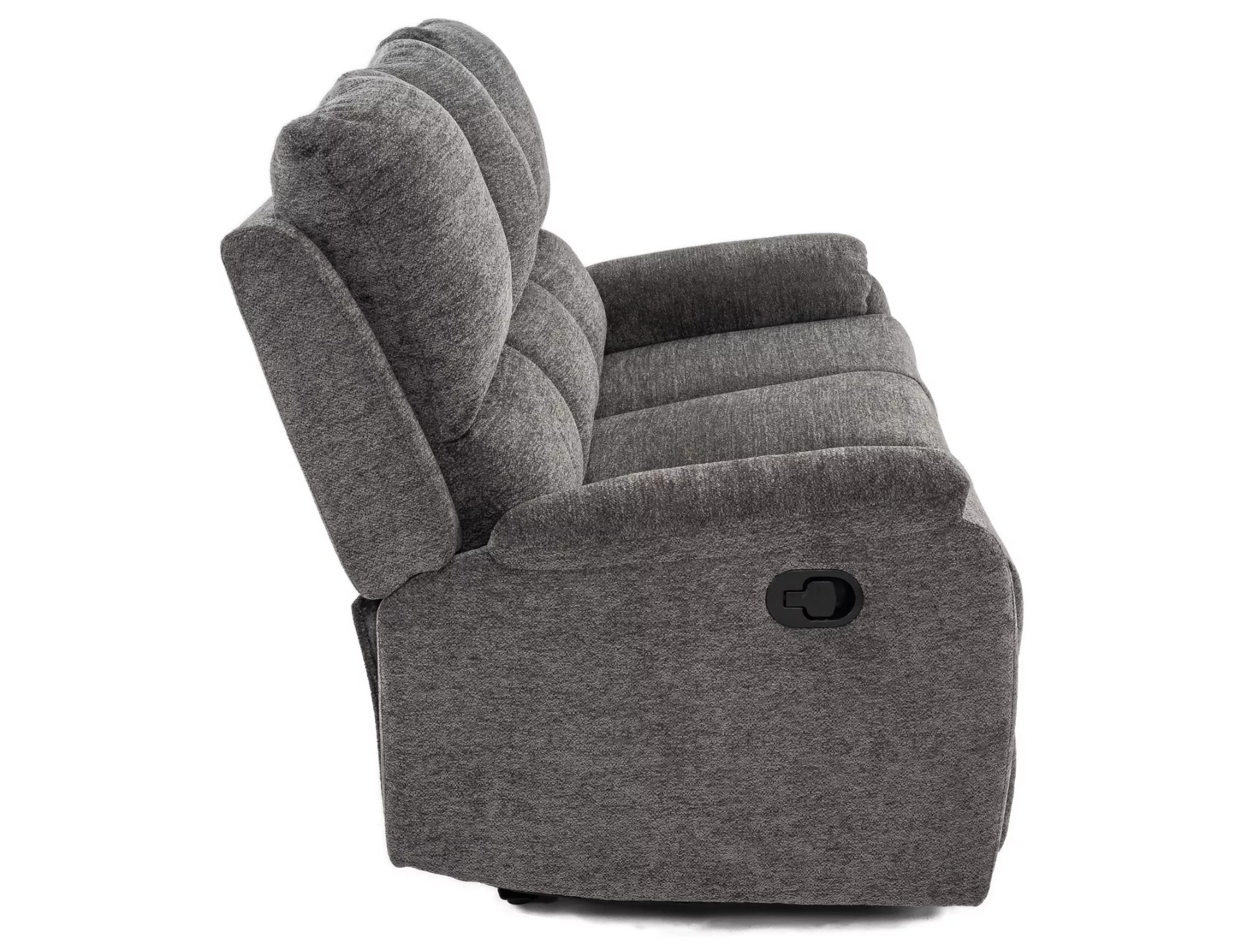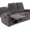 Sofa 3-osobowa rozkładana, tkanina Raven 15, stelaż: metal, kolor: szary / czarny. Rozkładane dwa skrajne siedzenia – wysuwany podnóżek oraz odchylane oparcie, część środkowa nieruchoma.