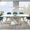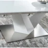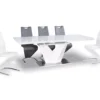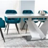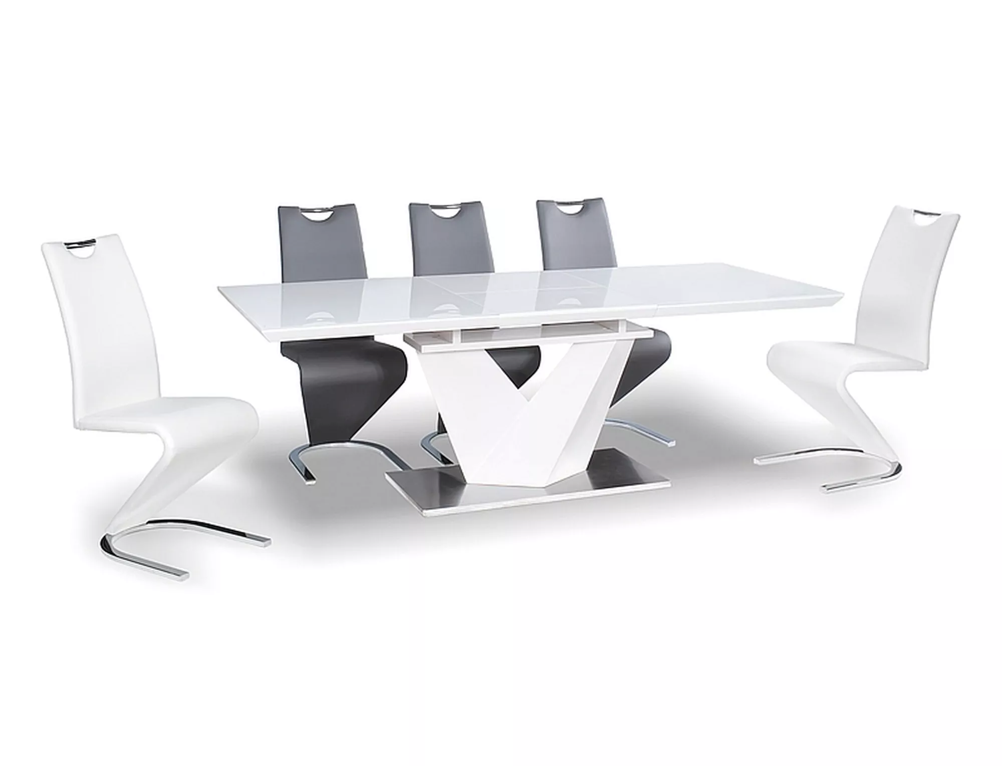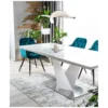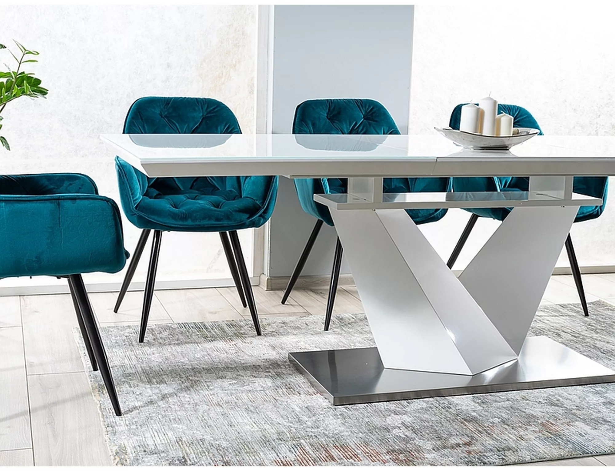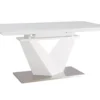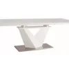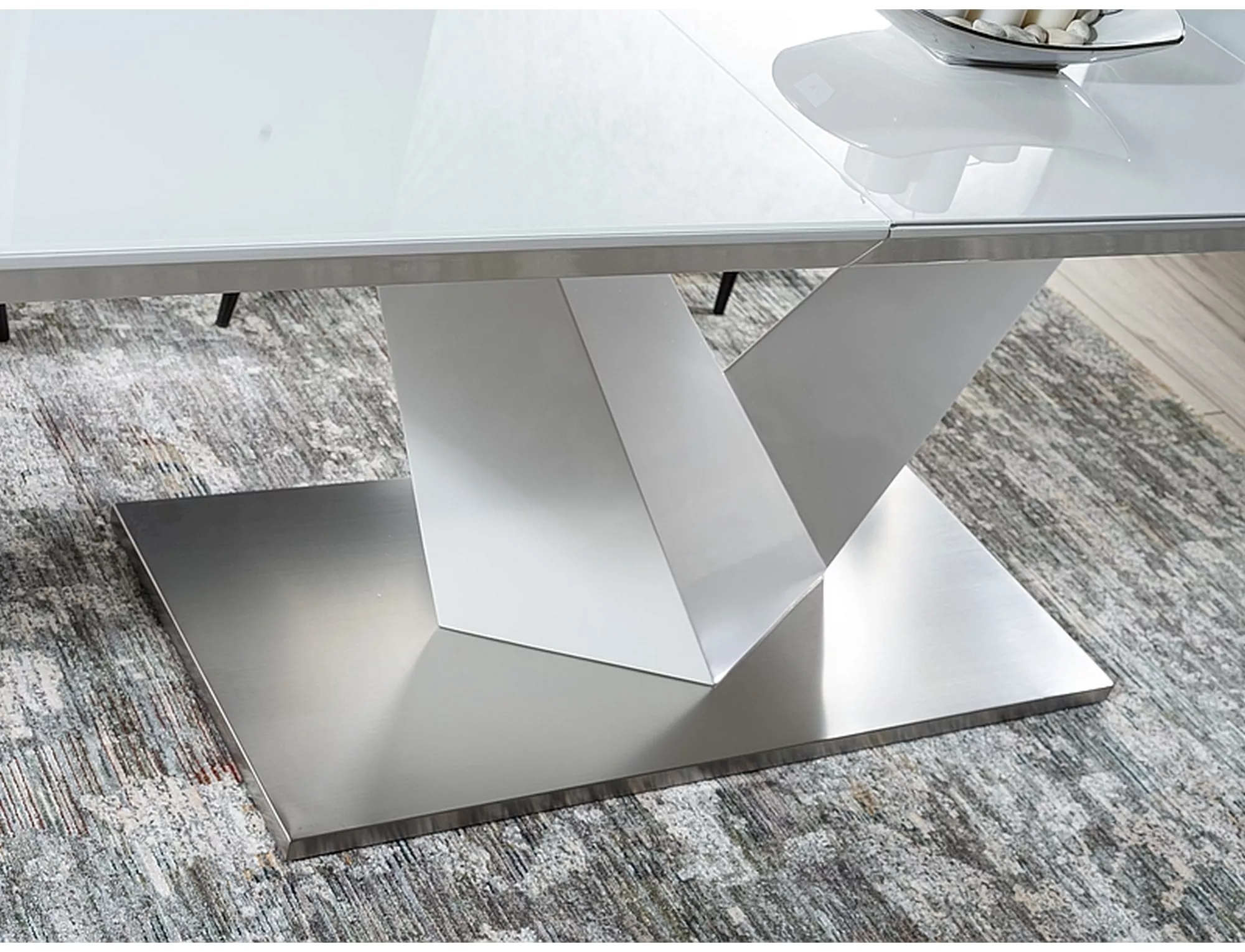 Stół rozkładany, blat: szkło hartowane+MDF, podstawa MDF+stal szczotkowana, kolor: biały lakier+biały.
