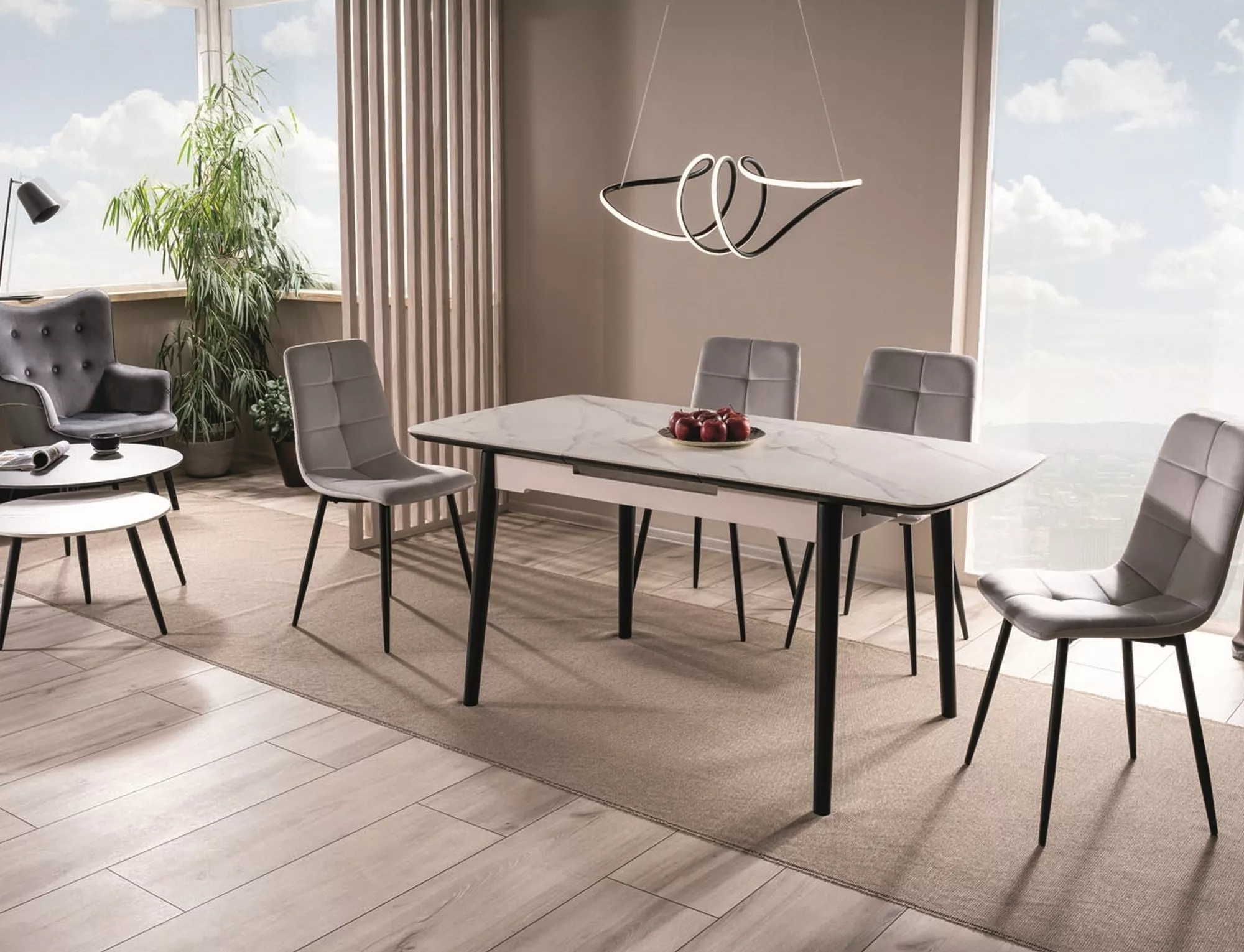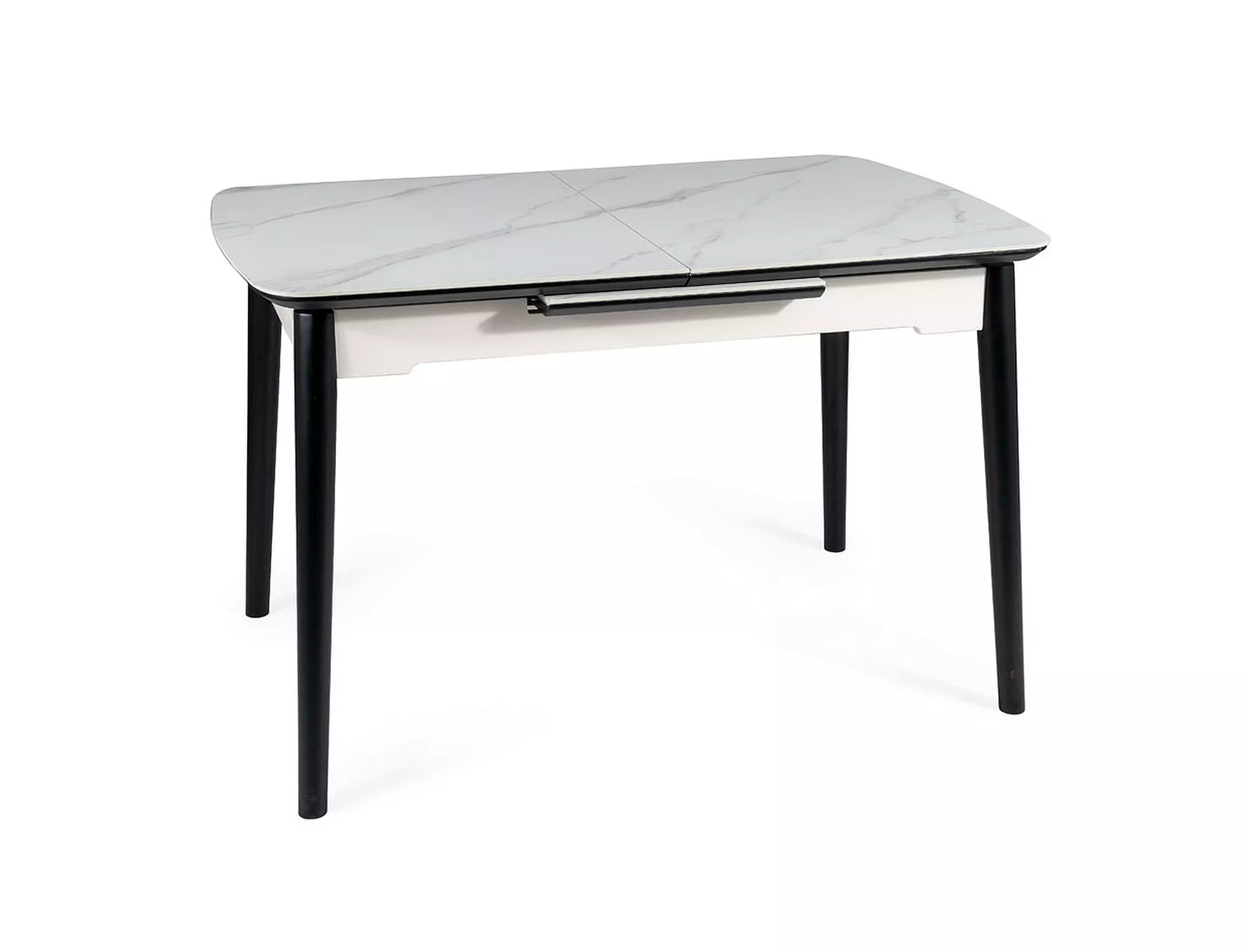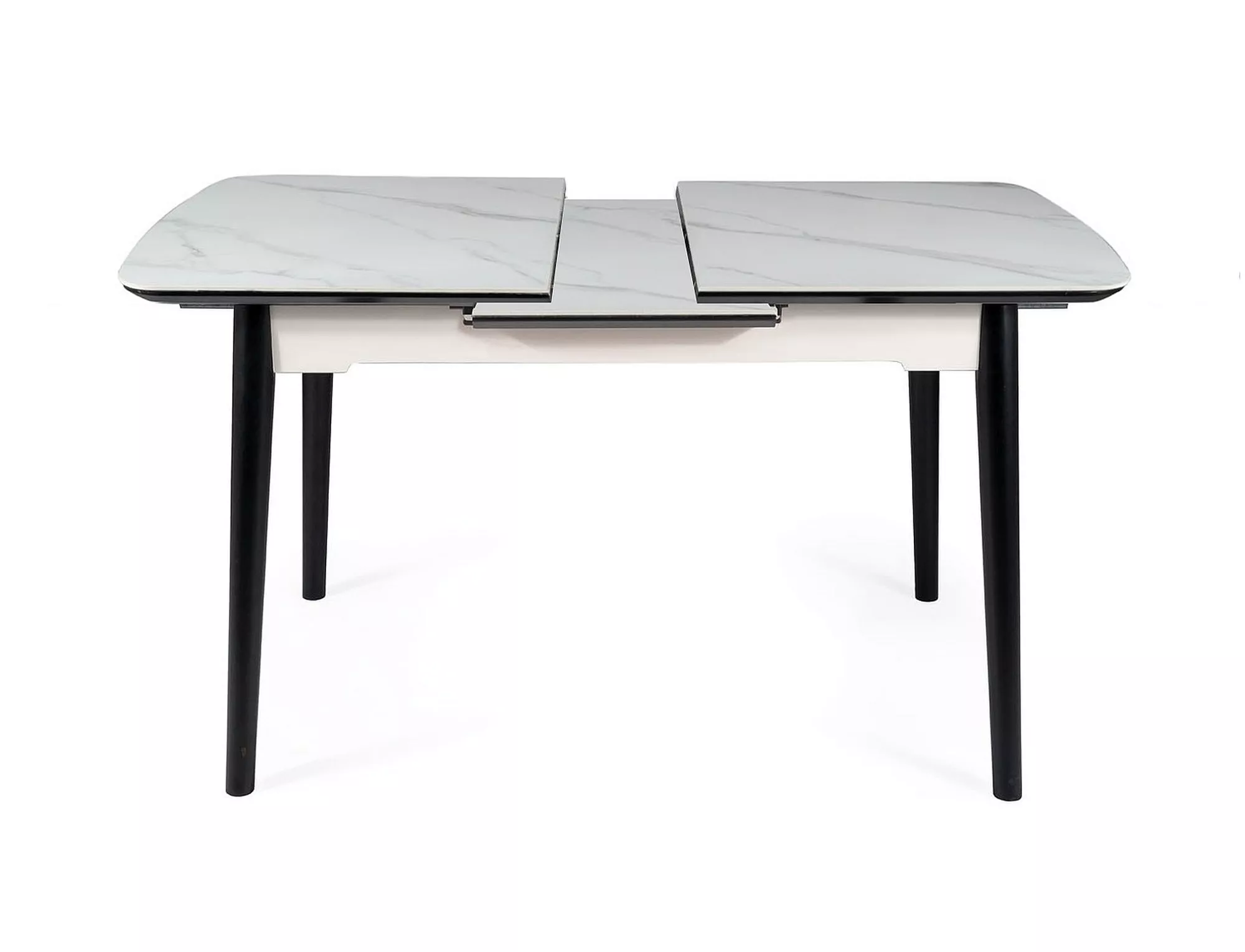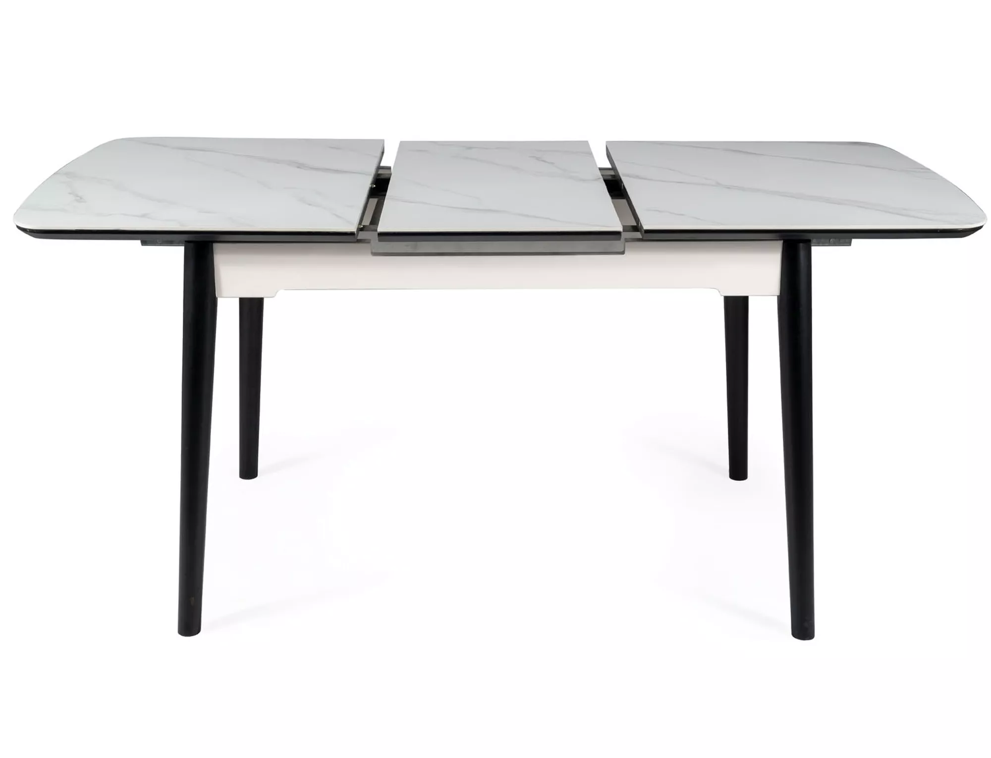 Stół rozkładany, blat: MDF + ceramika, efekt marmuru, stelaż: drewno, kolor: biały / czarny mat.