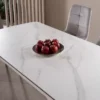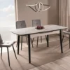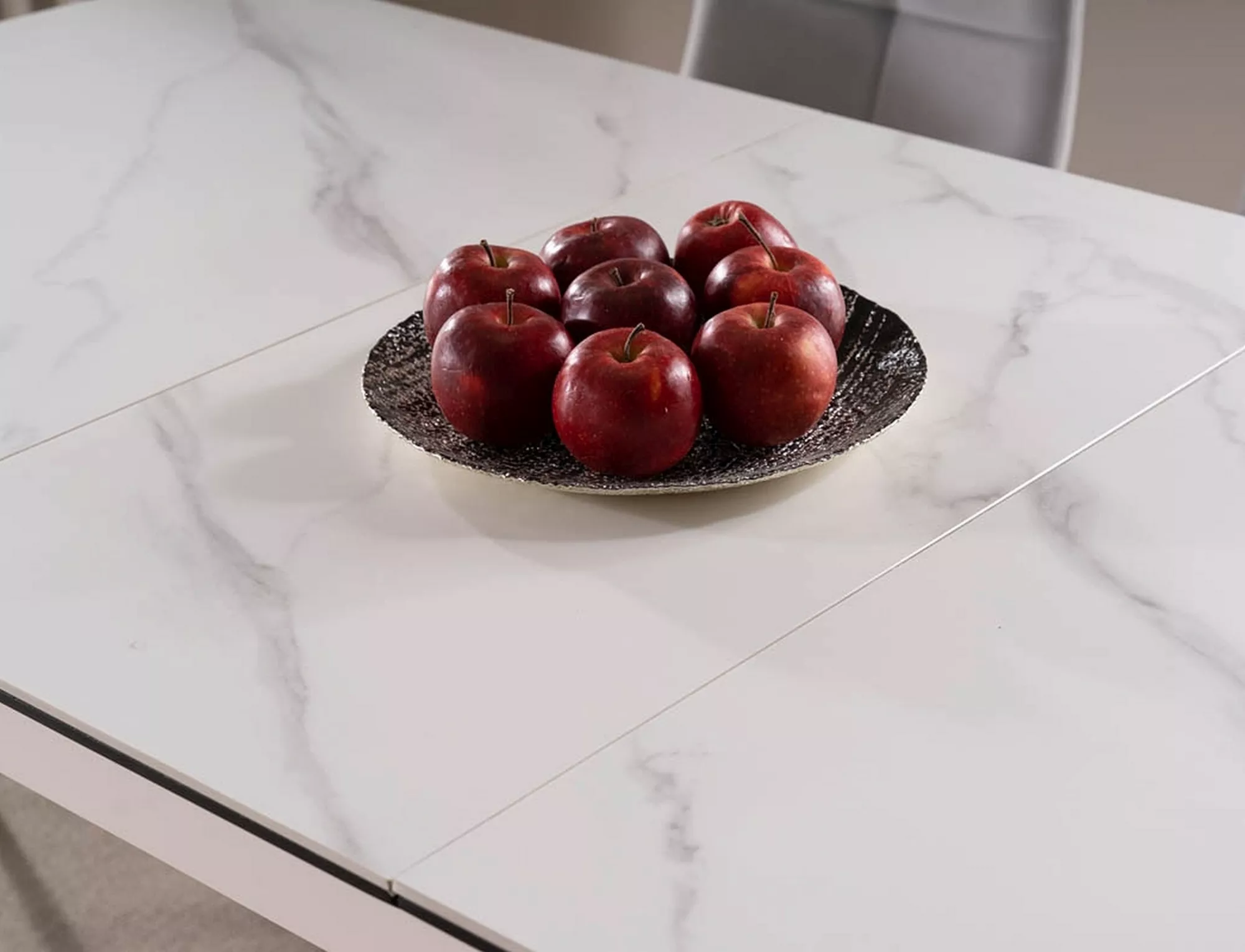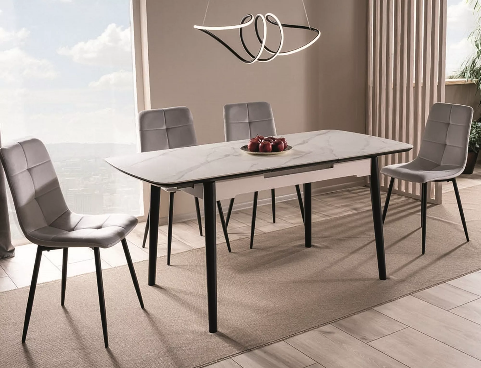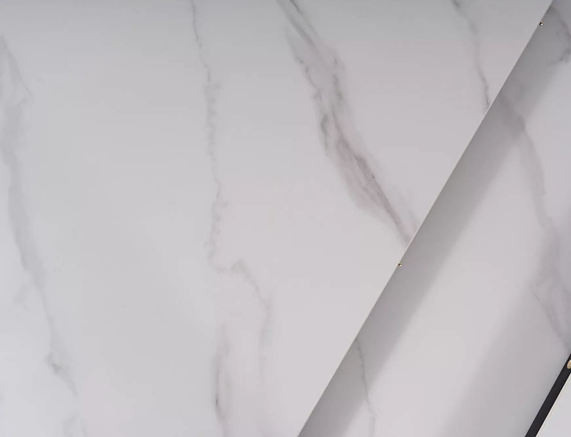 Stół rozkładany, blat: MDF + ceramika, efekt marmuru, stelaż: drewno, kolor: biały / czarny mat.