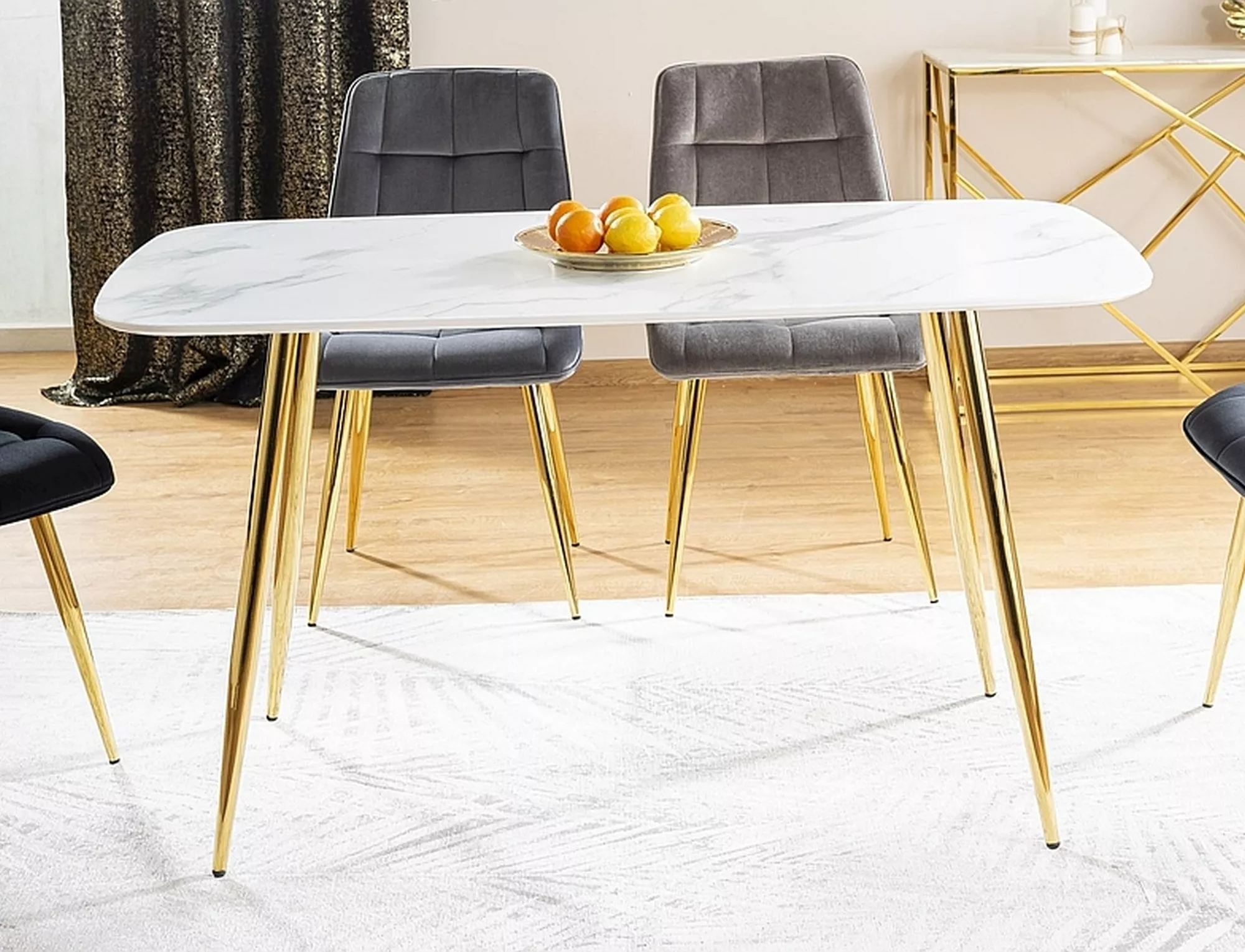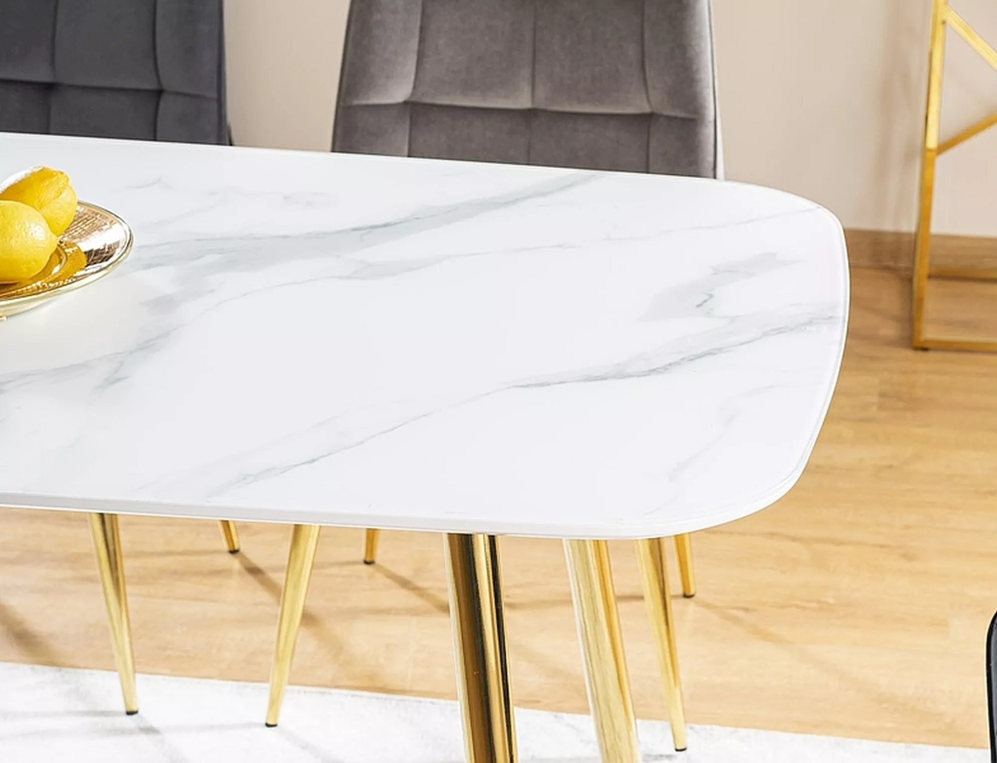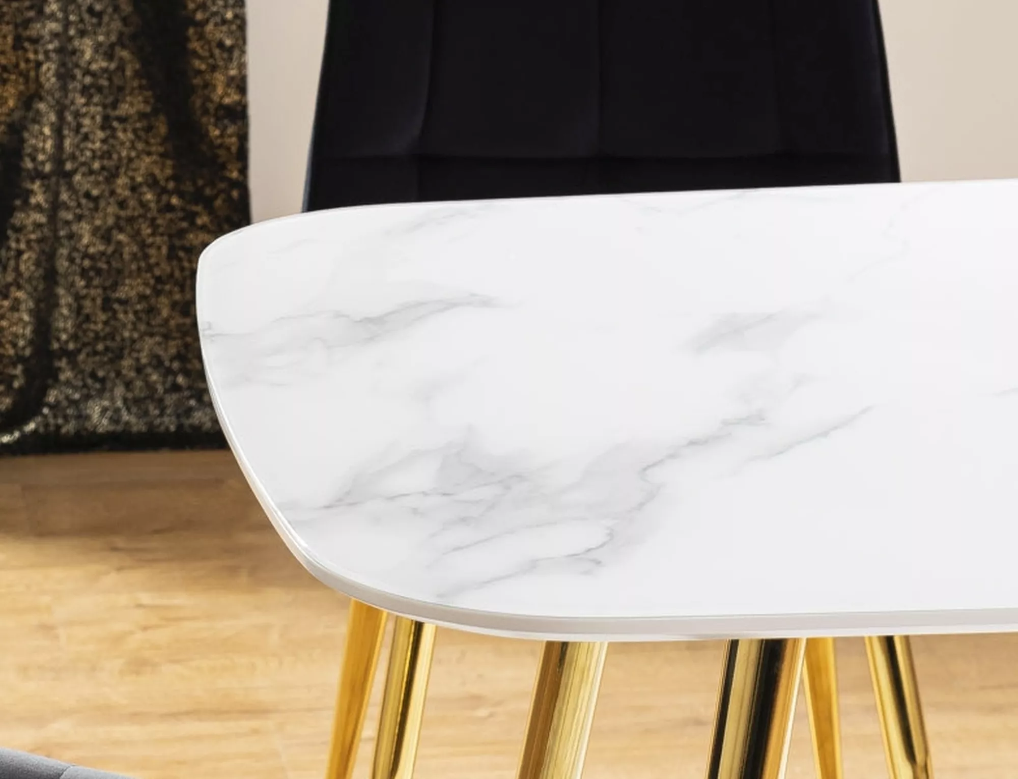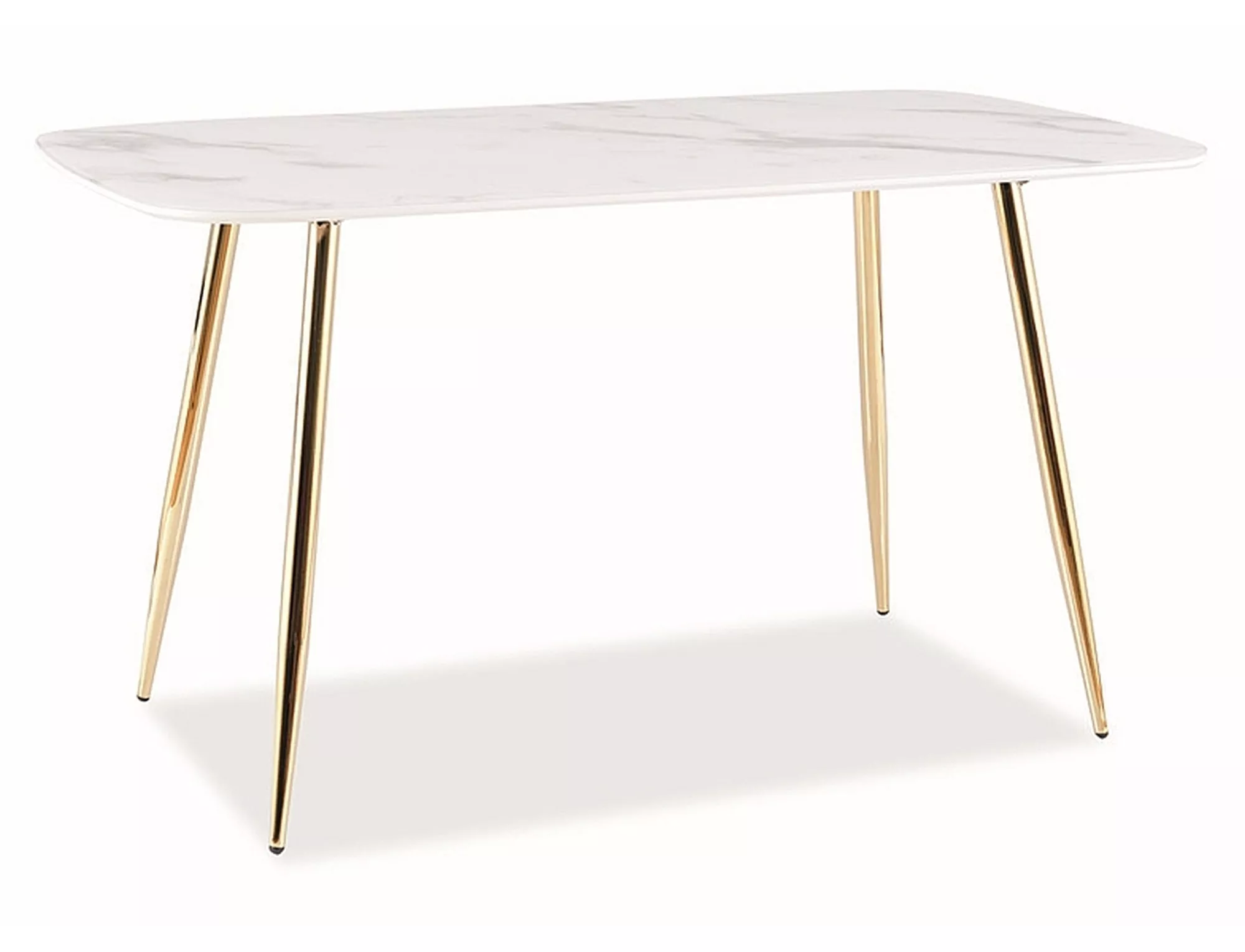 Stół, blat: MDF+szkło, efekt marmuru, stelaż: metal, kolor: biały / złoty.