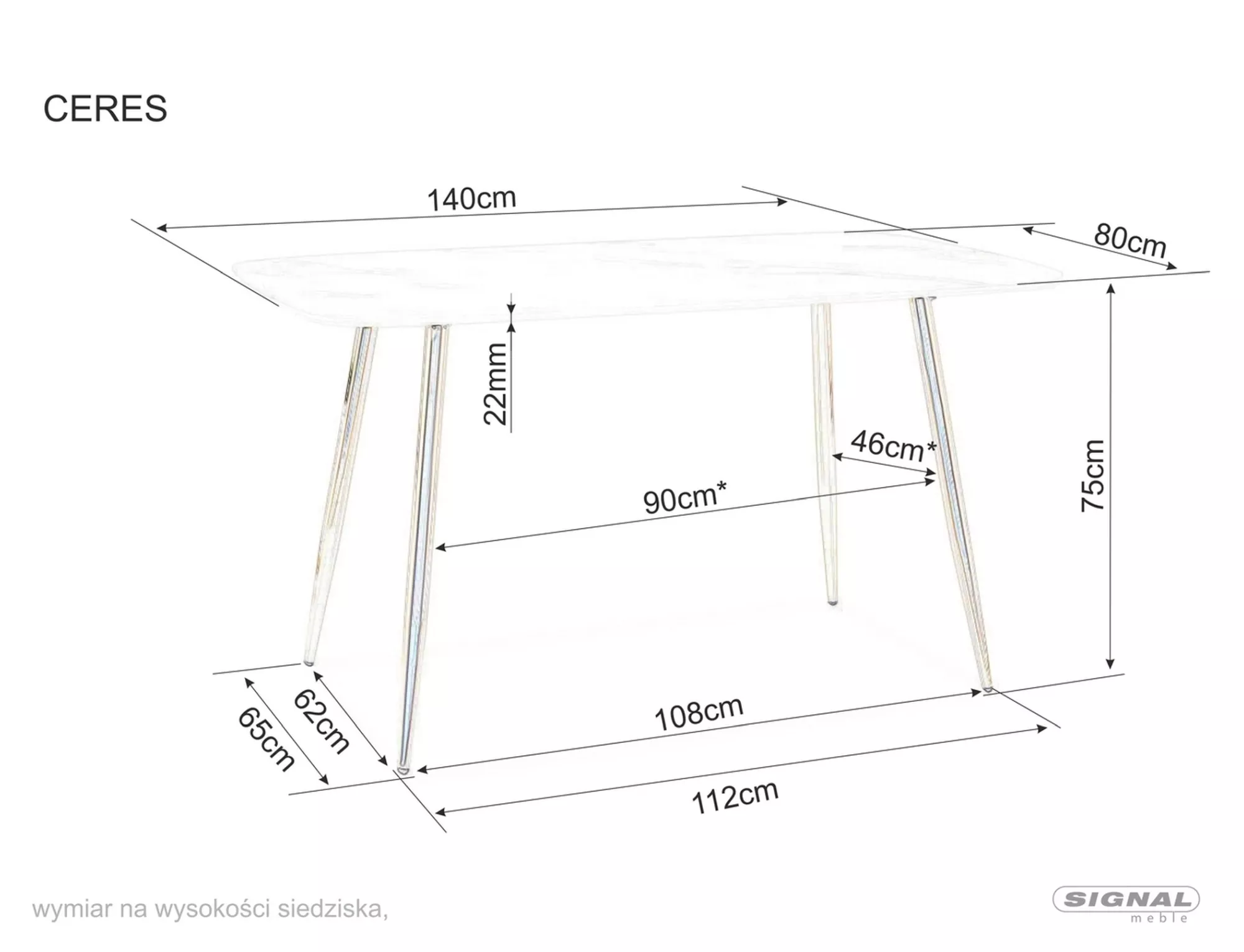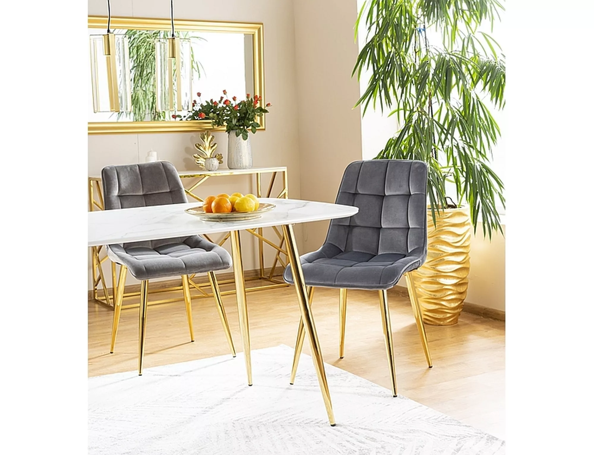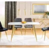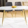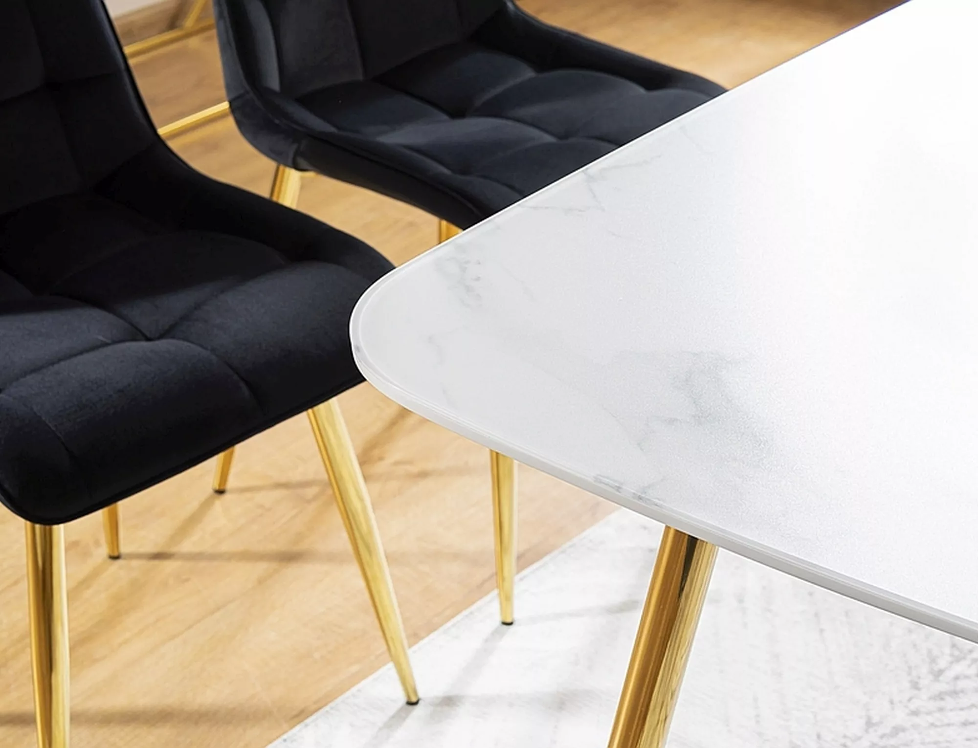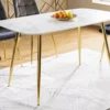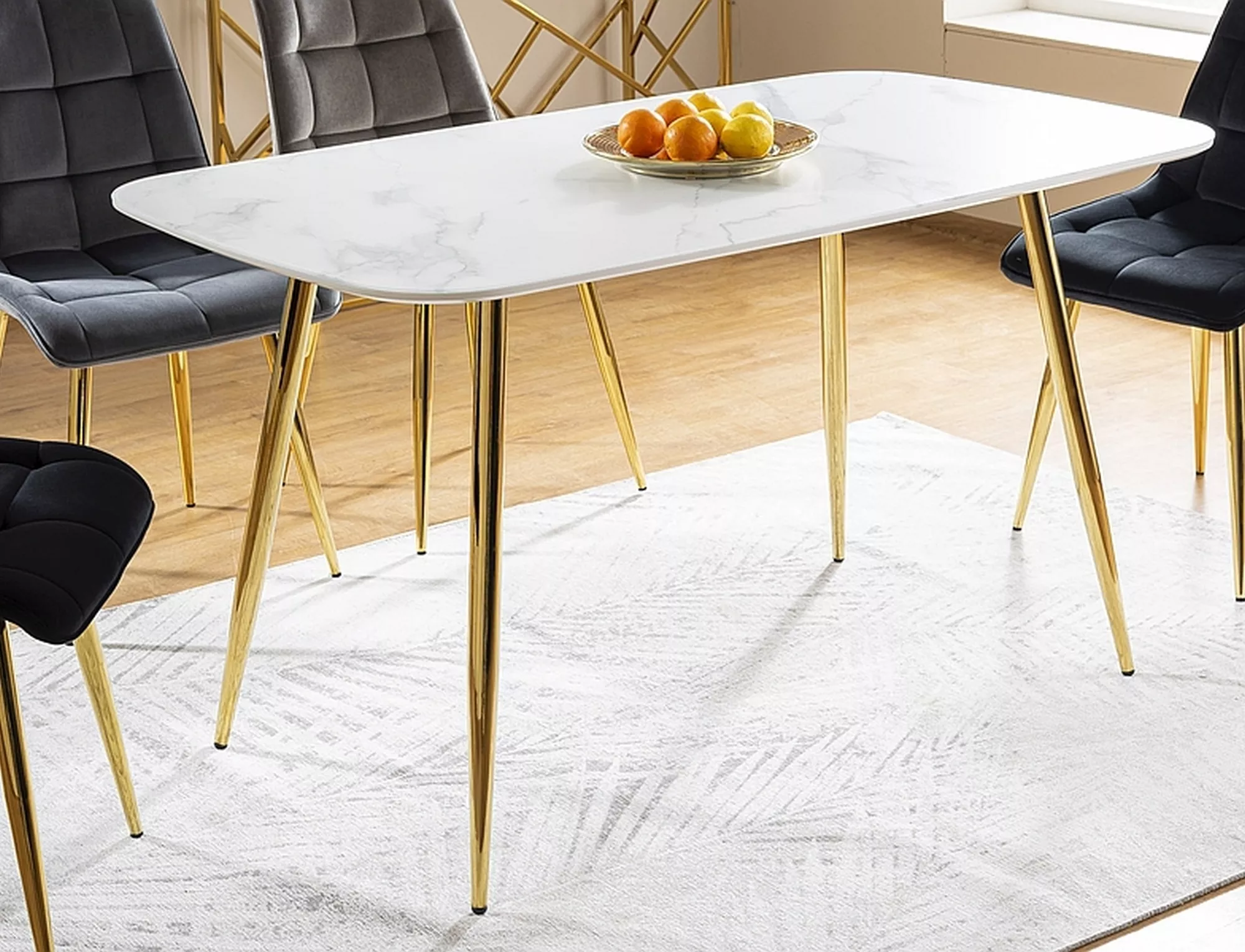 Stół, blat: MDF+szkło, efekt marmuru, stelaż: metal, kolor: biały / złoty.