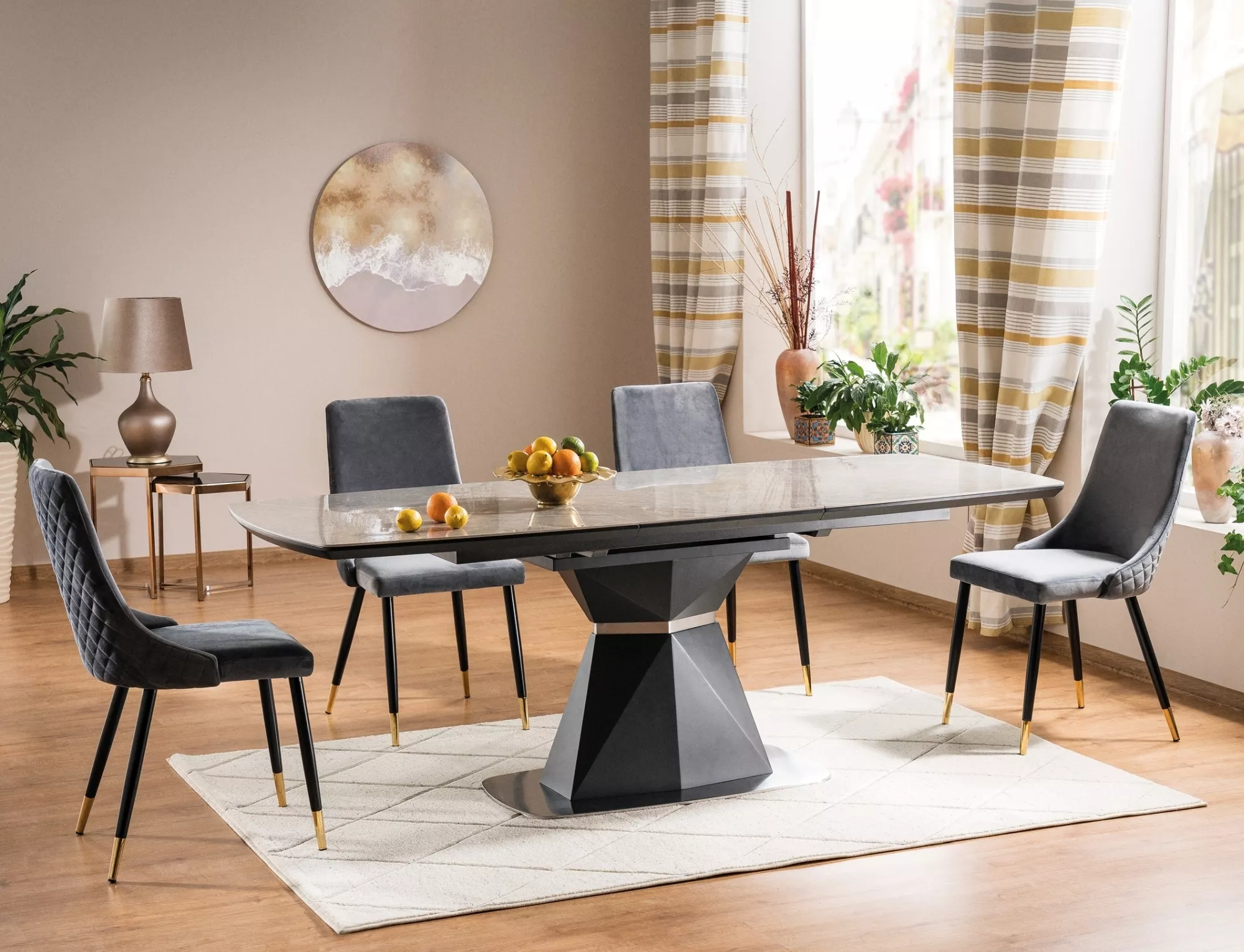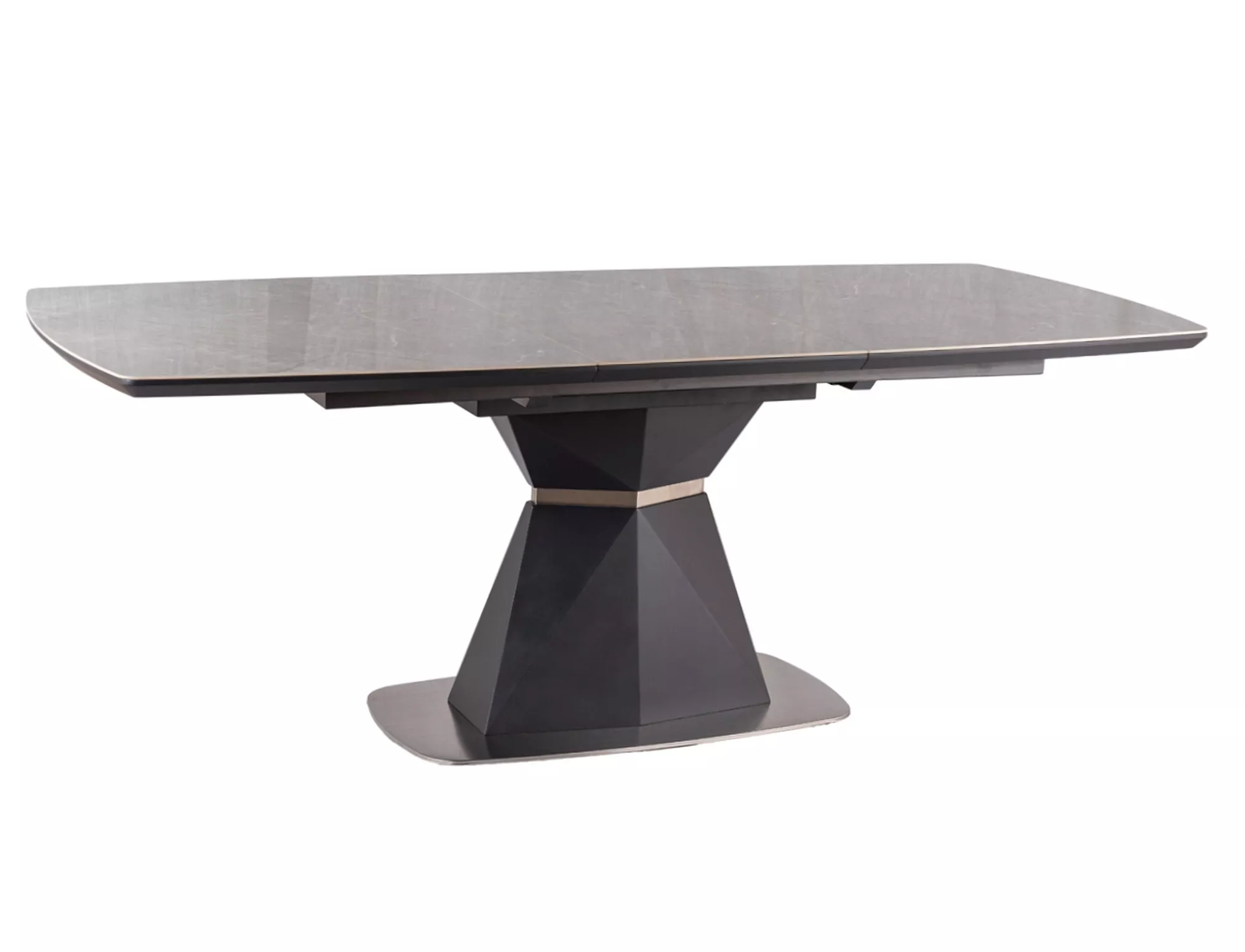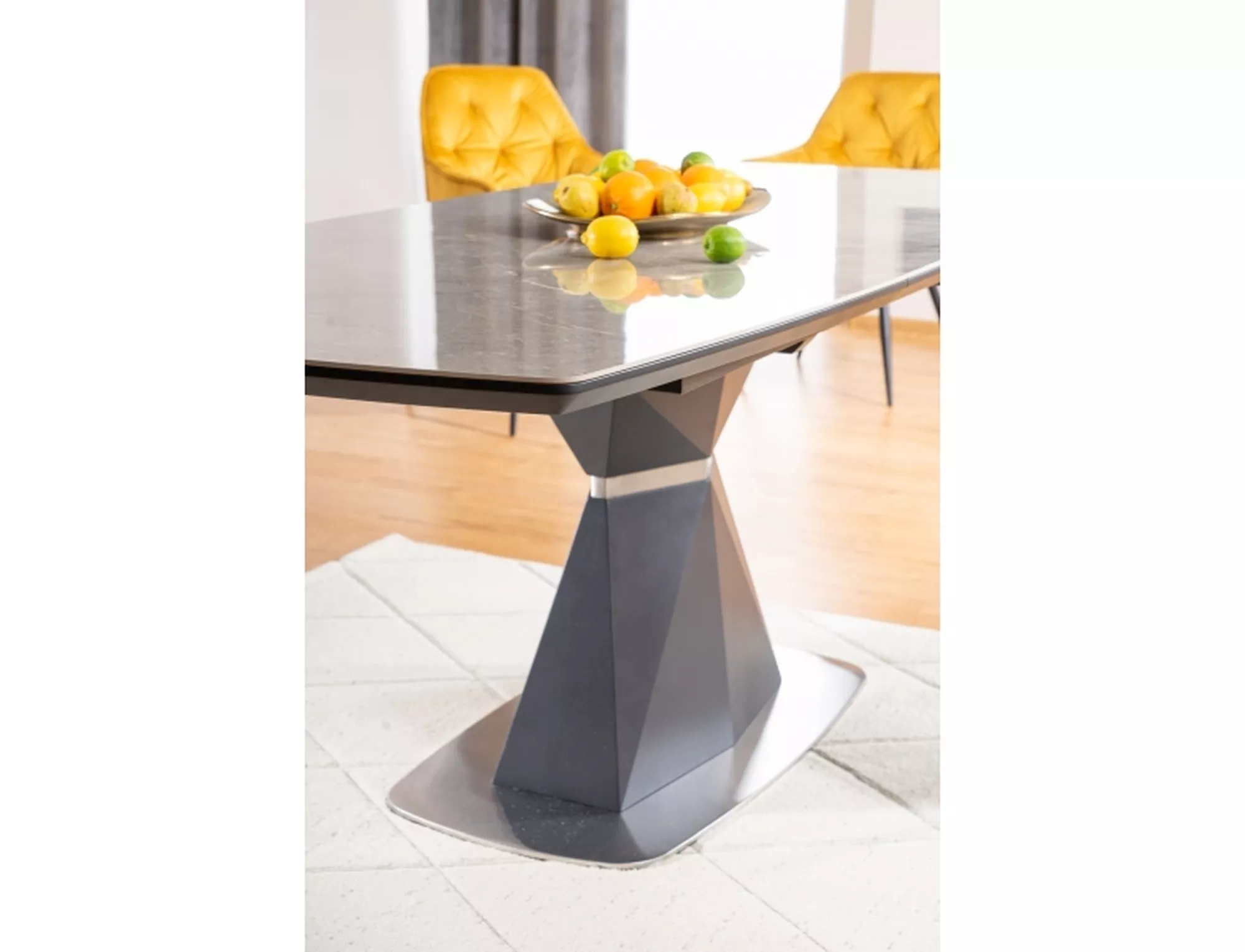 Stół rozkładany, blat: MDF+ceramika, efekt marmuru, stelaż: MDF+stal szczotkowana, kolor: szary marmur / antracyt mat.