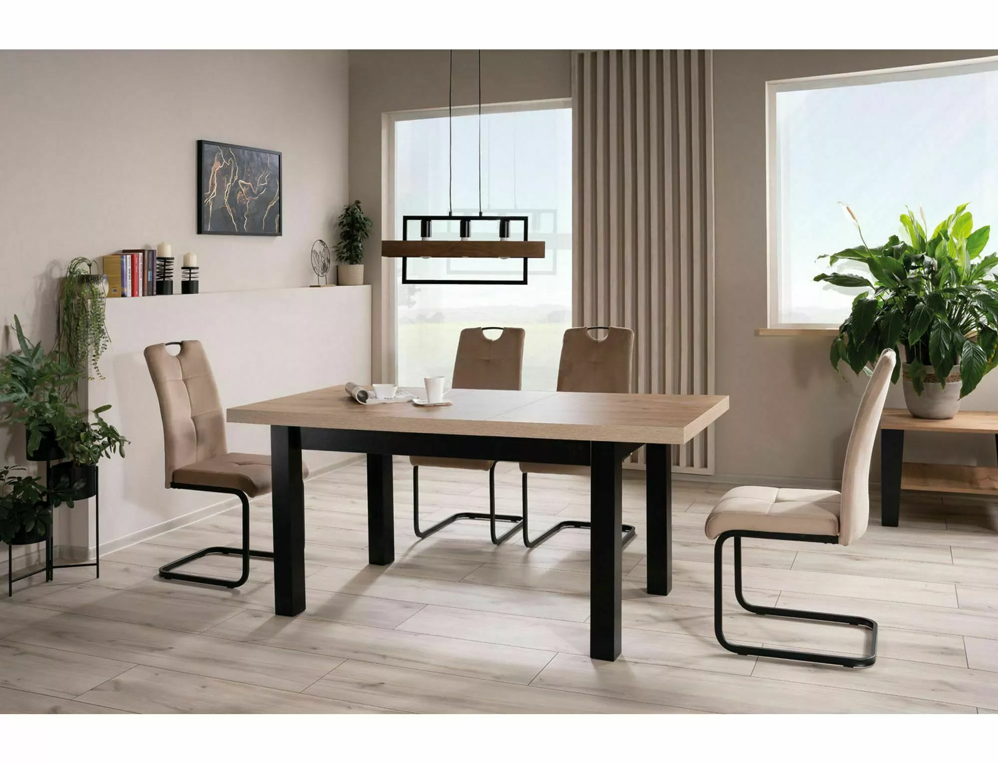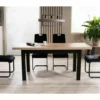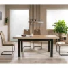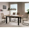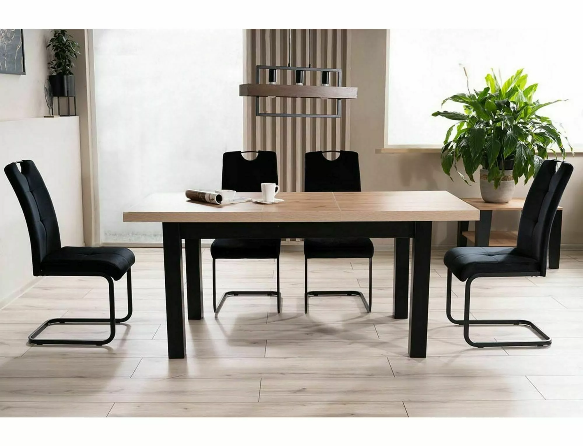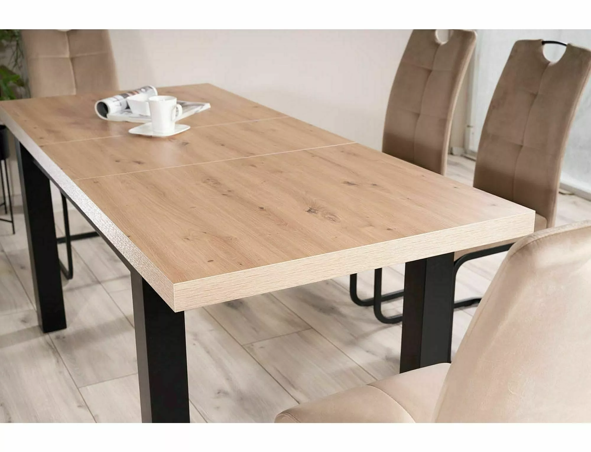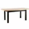 Stół rozkładany, blat i stelaż: płyta laminowana, kolor: dąb artisan / czarny. Dwie wkładki o wymiarach 39x80cm przechowywane pod blatem. Profil nogi 66x66mm