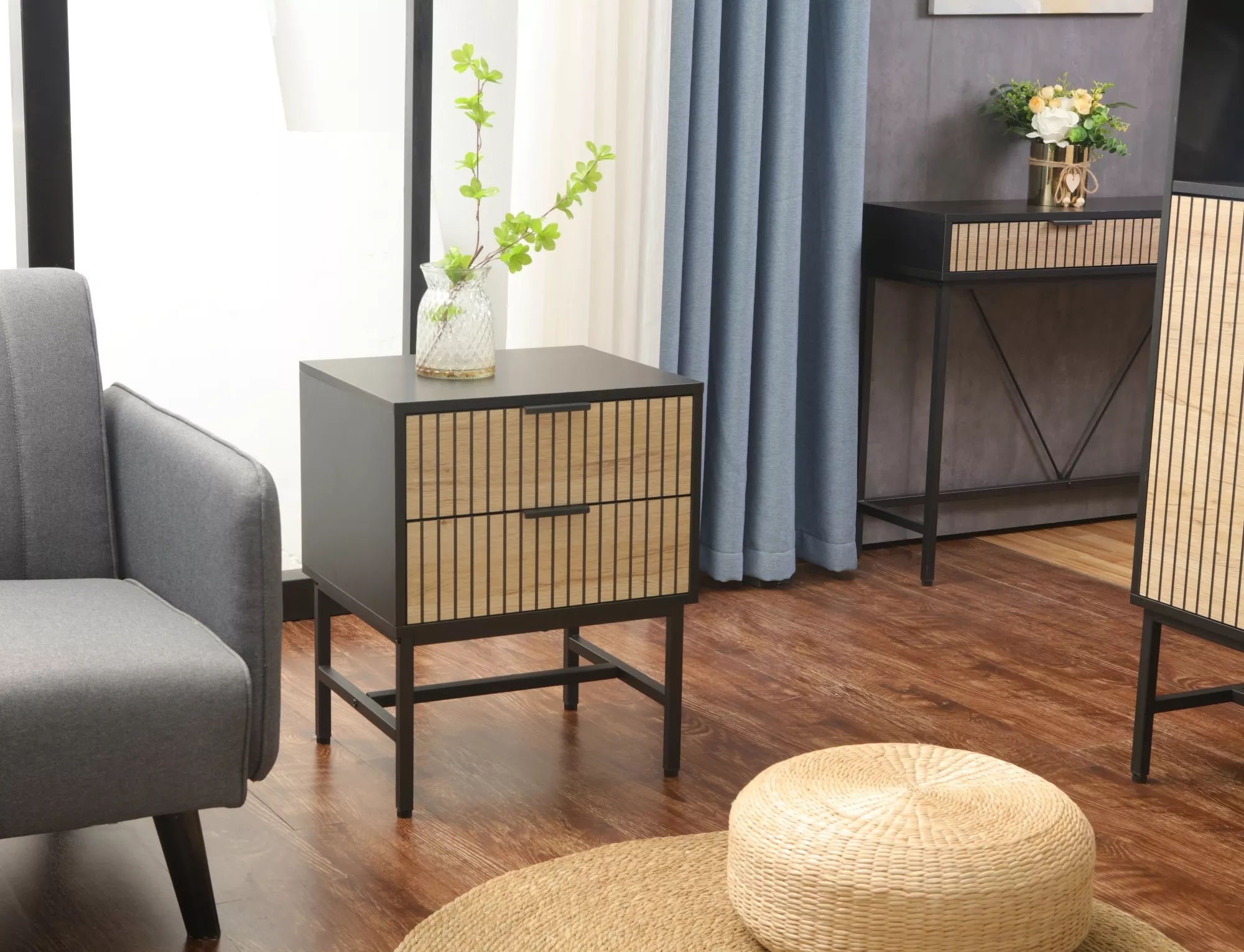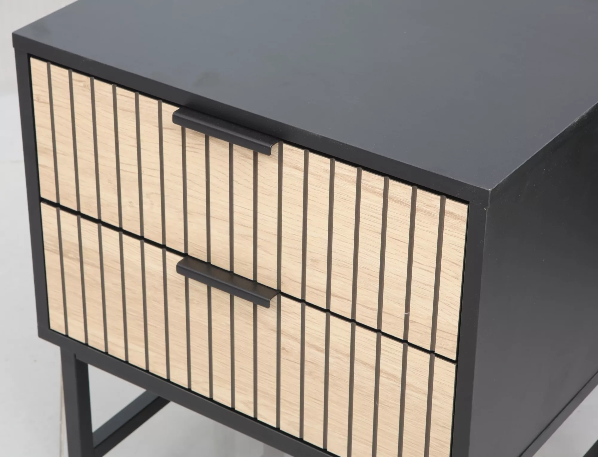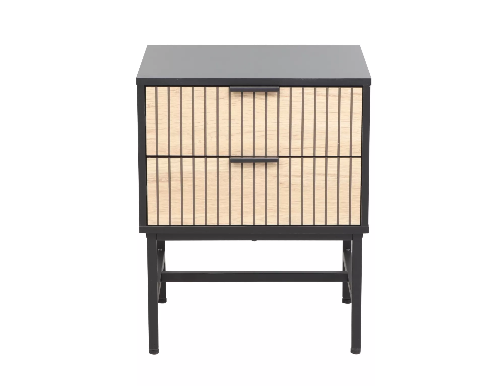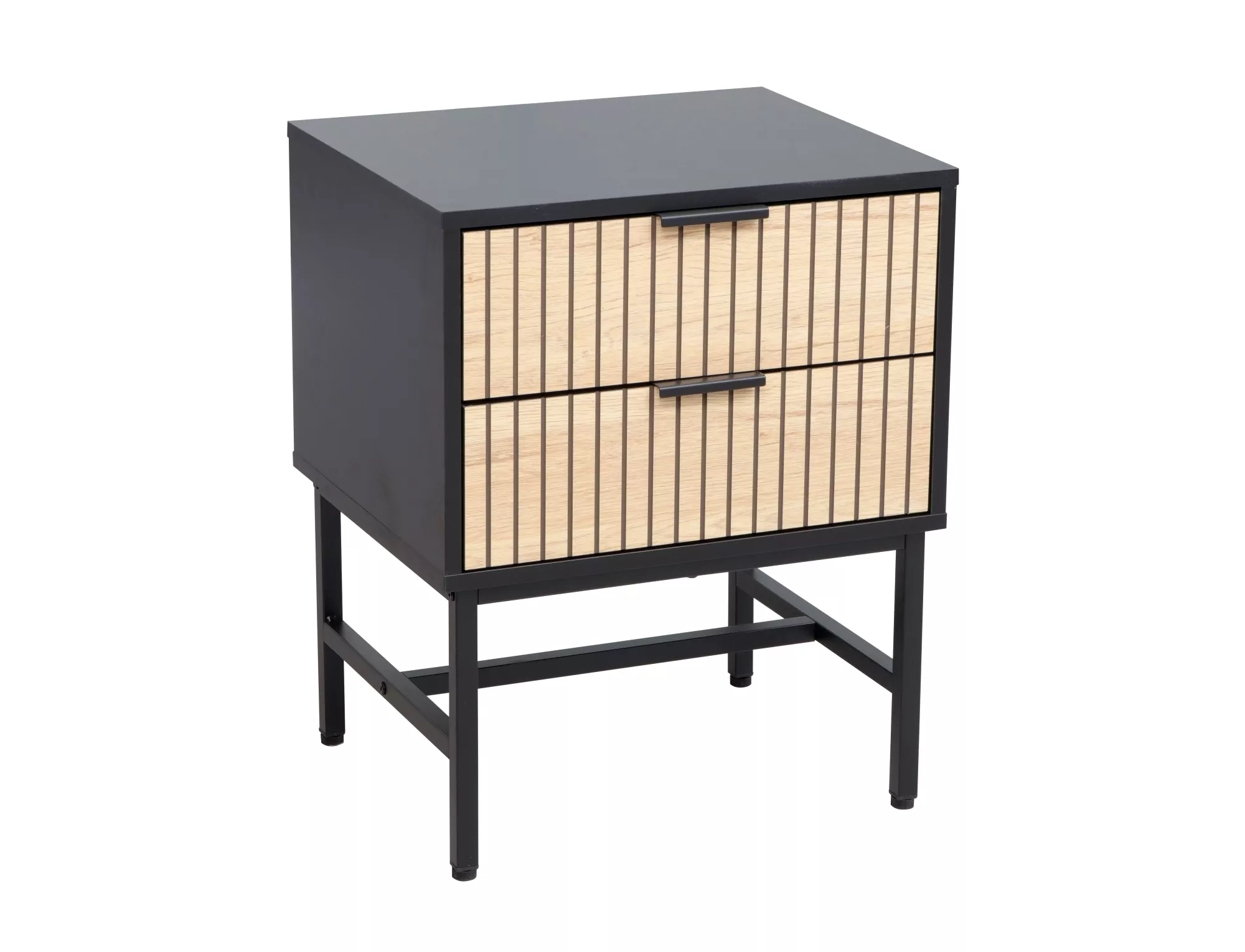 Ława, blat: płyta laminowana, stelaż: metal, kolor: dąb + czarnt mat / czarny. Wysokość nóżek 32cm.