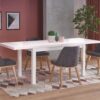 stół rozkładany, wymiary: 140-220/80/77 cm, materiał: blat – MDF laminowany, na obrzeżach ABS, nogi – MDF laminowany, kolor: blat – biały, nogi – biały