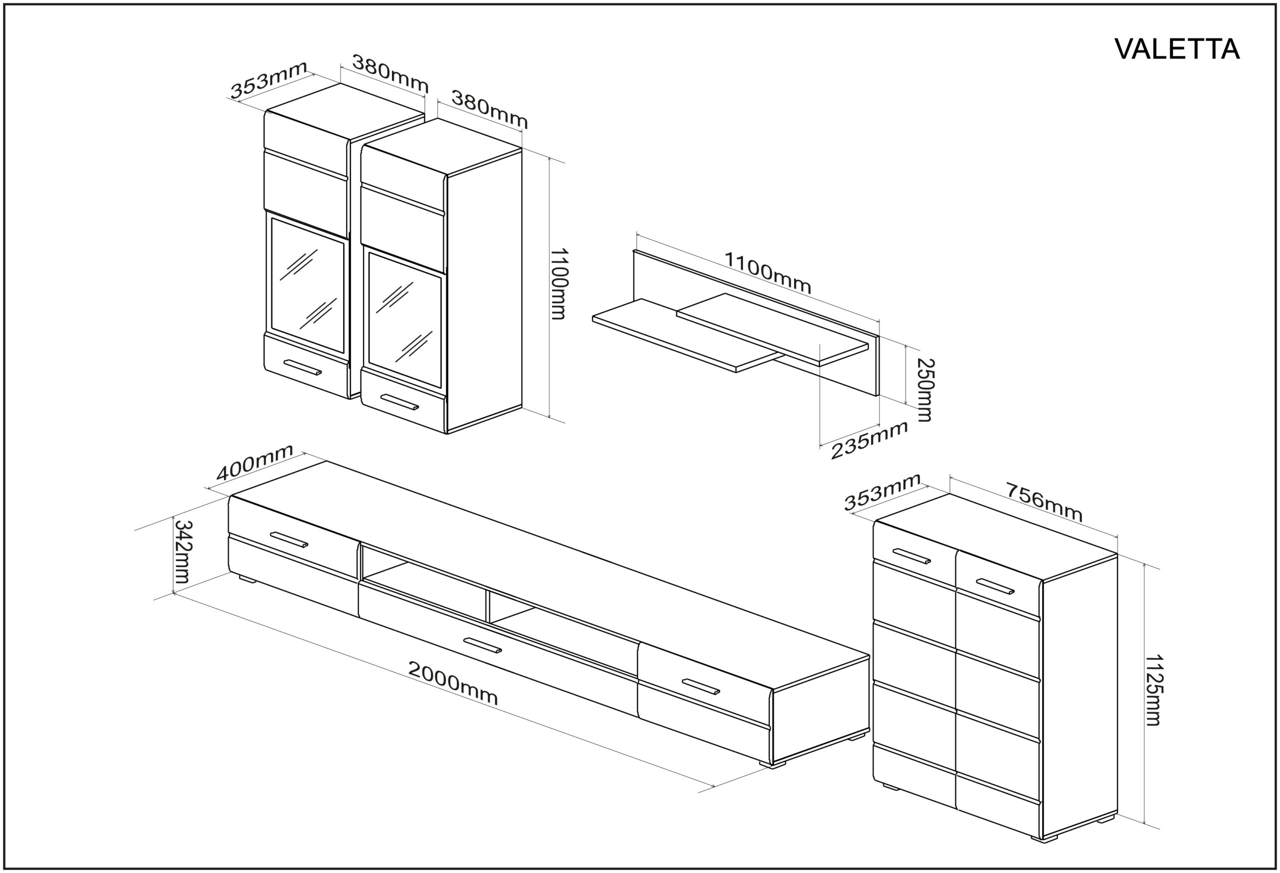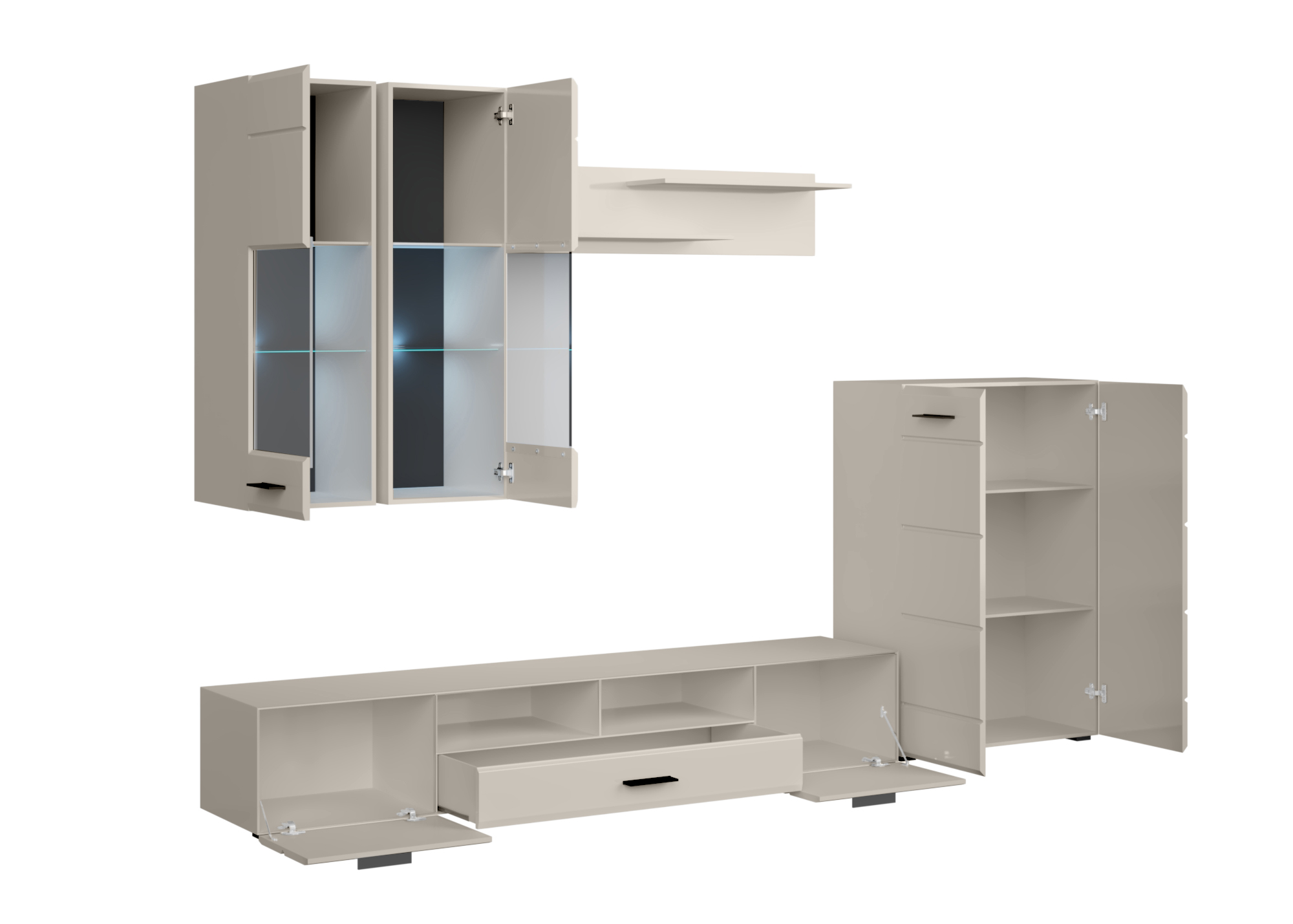 zestaw mebli, materiał: korpus – płyta meblowa 16 mm, fronty – płyta MDF laminowana, uchwyty plastikowe, oświetlenie LED, zawiasy Hettich, kolor: kaszmir