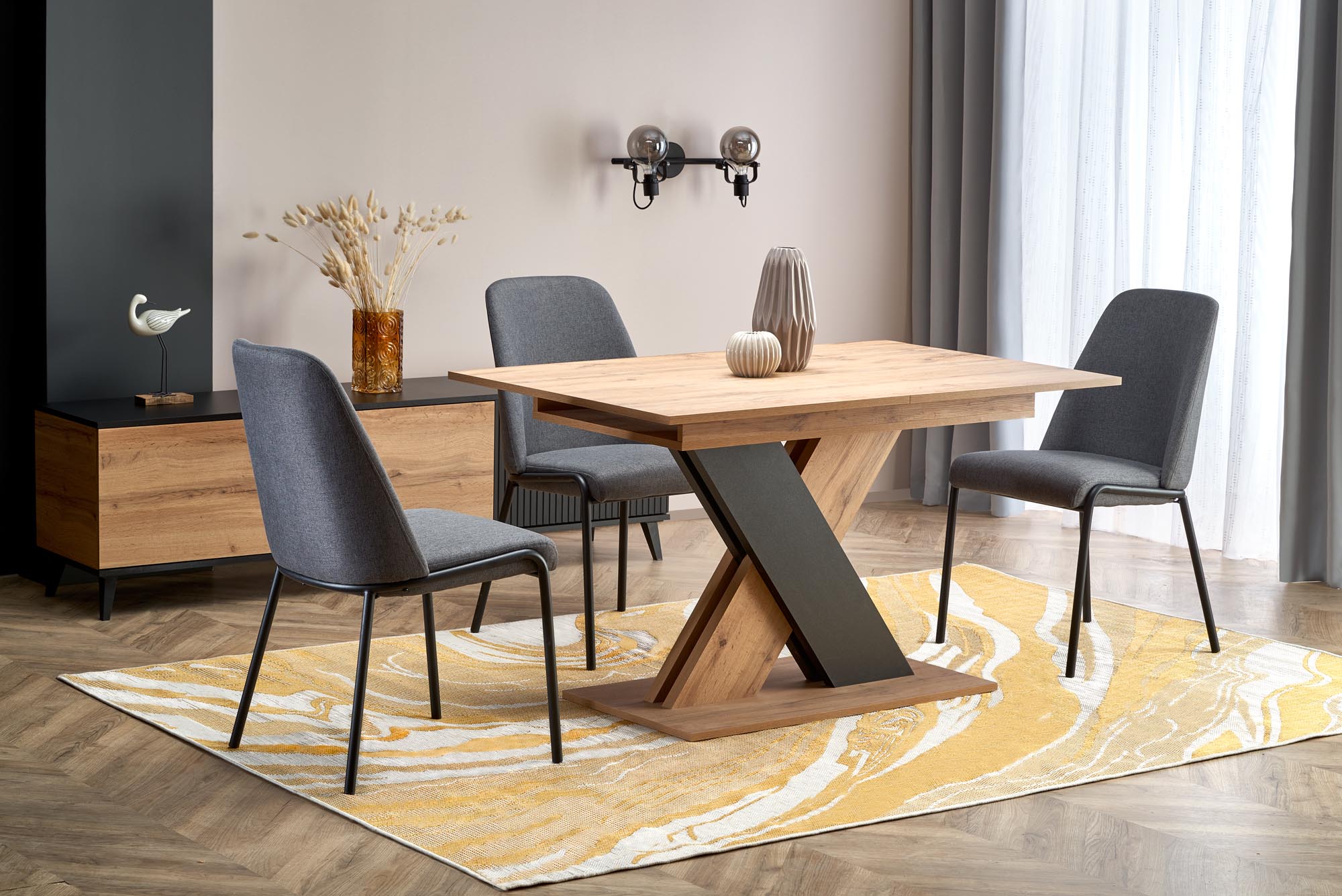wymiary: 130-175/85/76 cm, stół rozkładany, materiał: płyta meblowa okleinowana, kolor: dąb wotan – czarny
