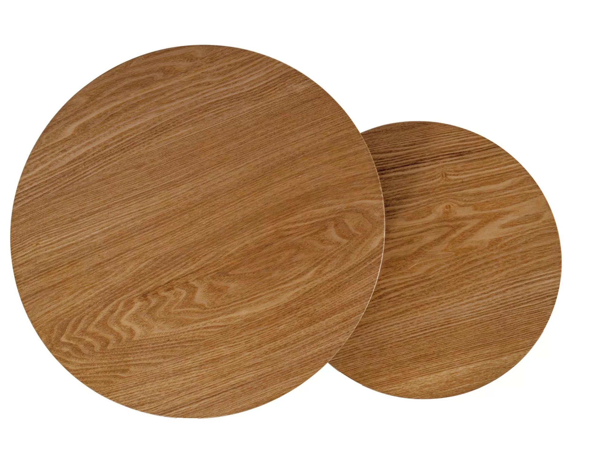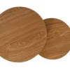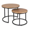 Zestaw ław, blat: MDF + okleina, stelaż: metal, kolor: dąb / czarny. Wymiary mniejszego stolika: średnica 43; wysokość: 35cm.