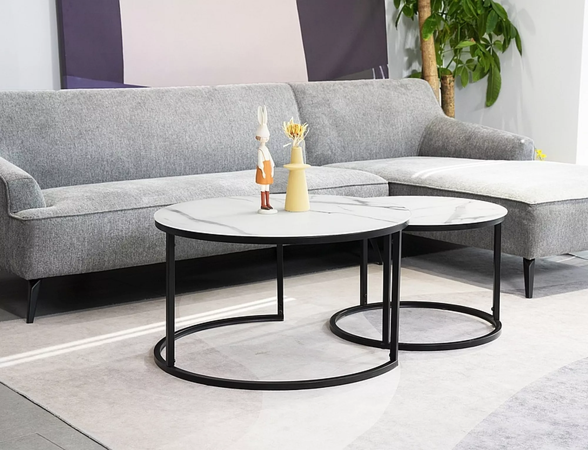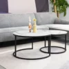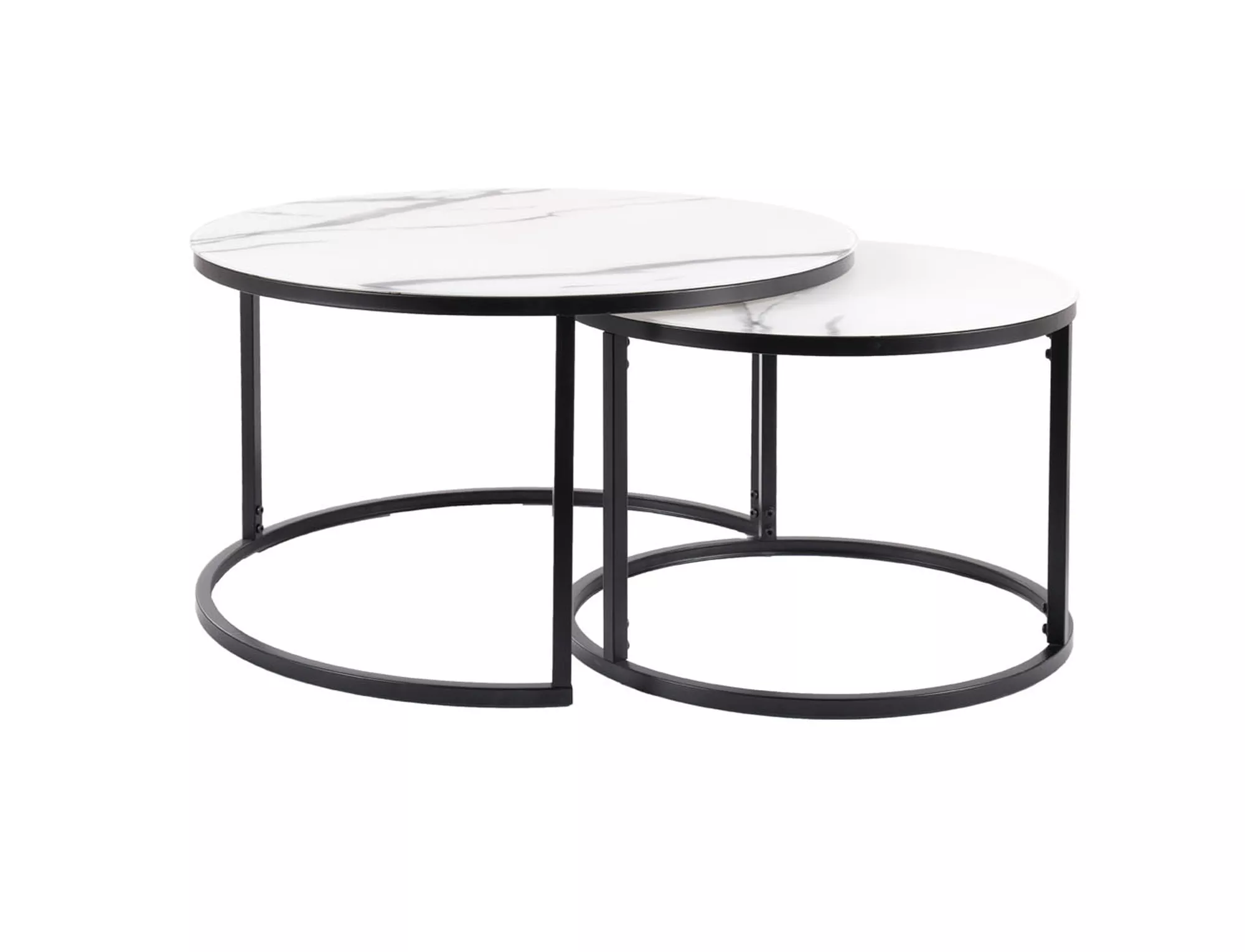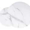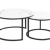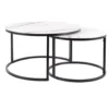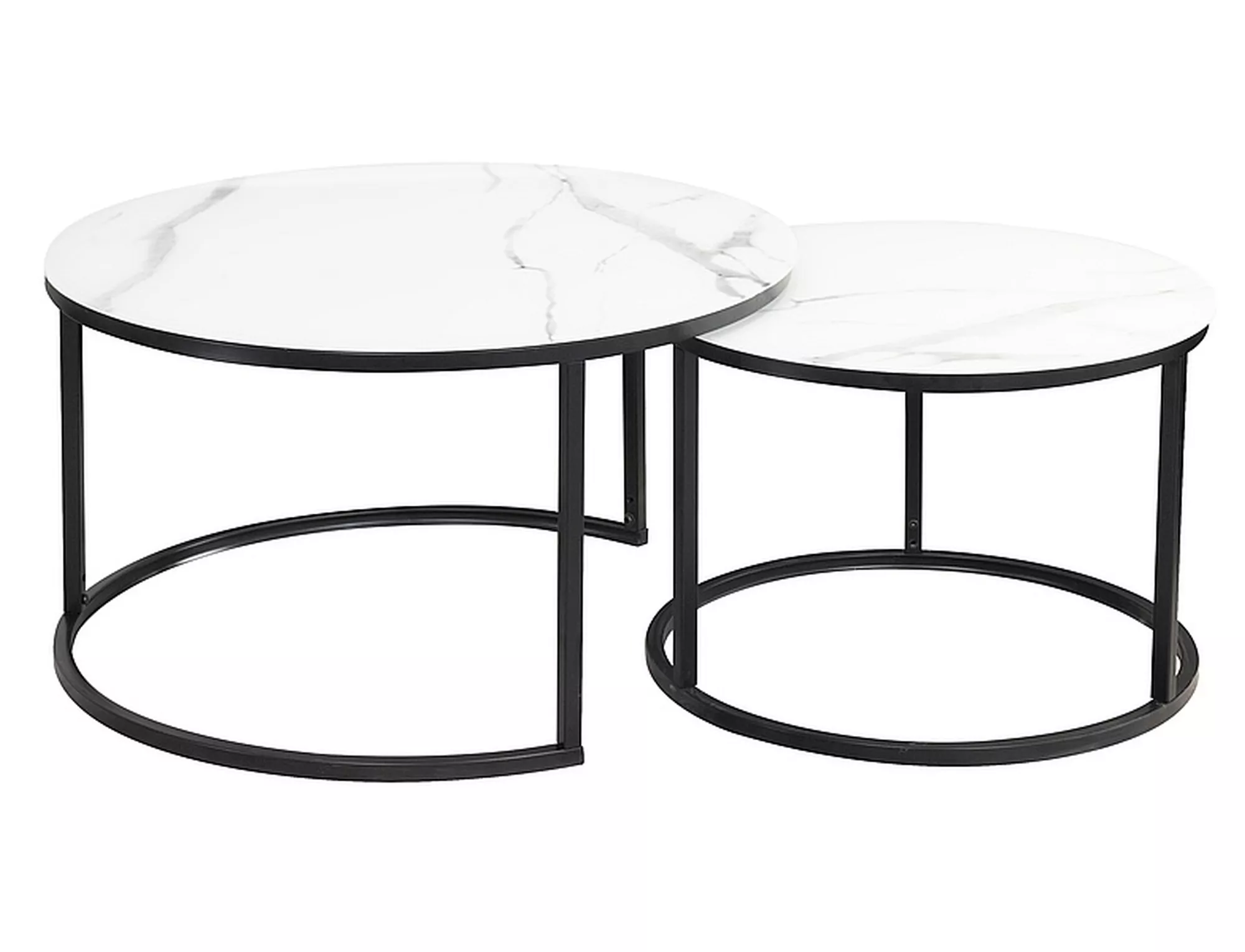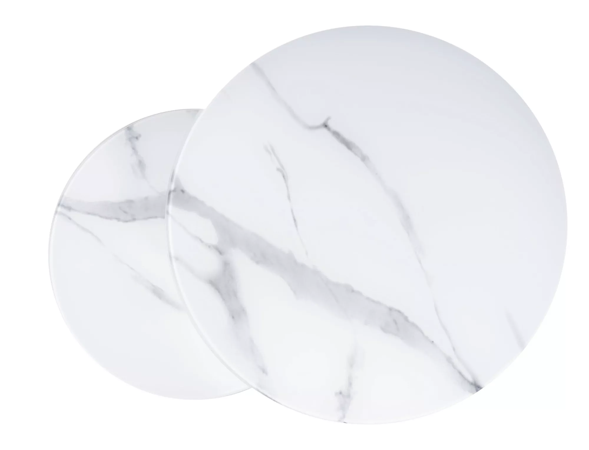 Zestaw ław, blat: szkło, stelaż: metal, kolor: biały mat, efekt marmuru / czarny mat. Wymiary mniejszego stolika fi: 60, h-42cm.