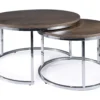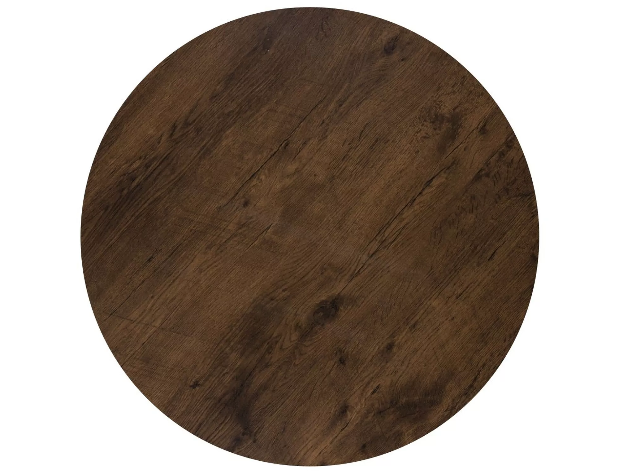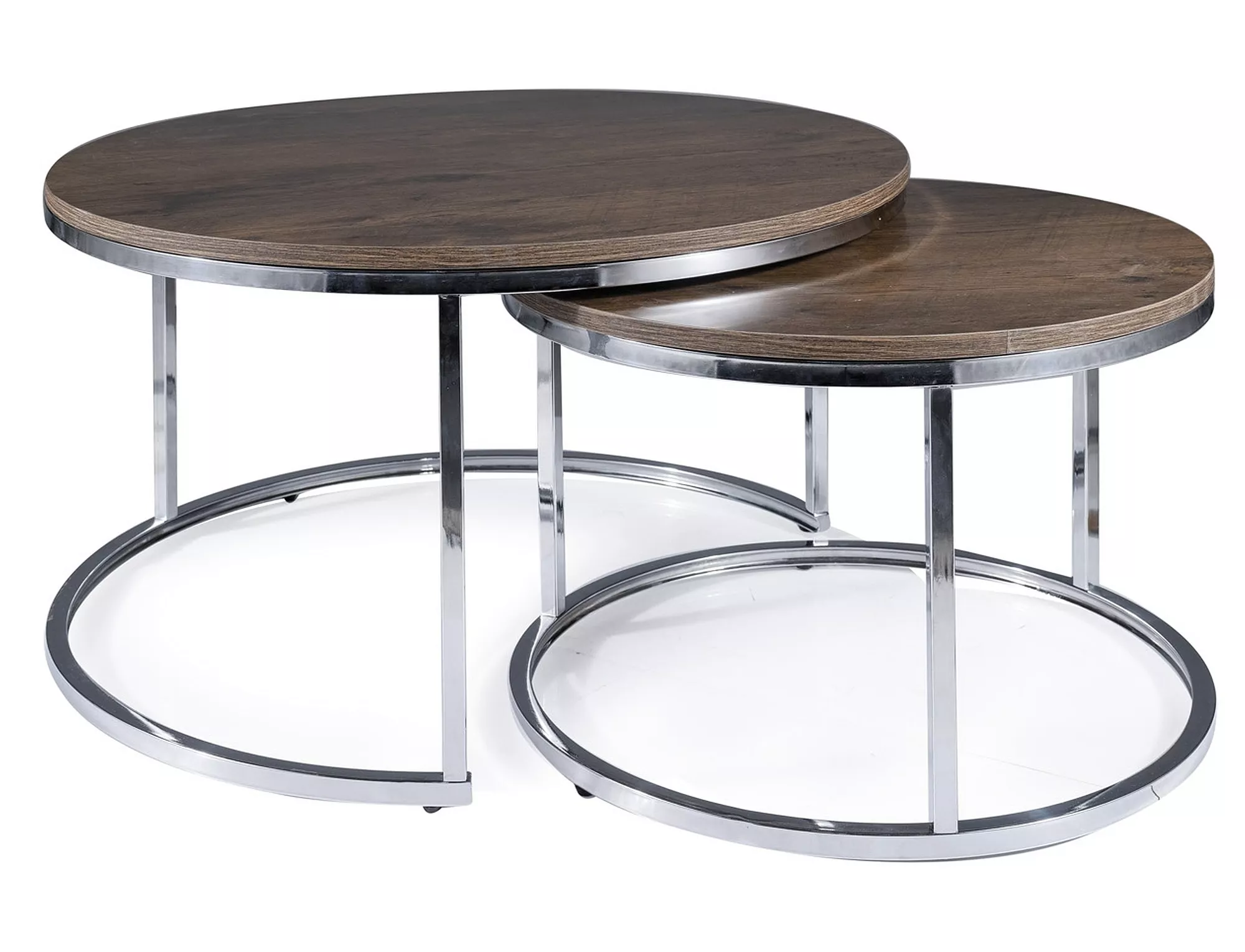 Zestaw ław, blat: płyta laminowana, stelaż: metal, kolor: dąb / czarny mat. Wymiary mniejszego stolika fi: 65, h-40cm.