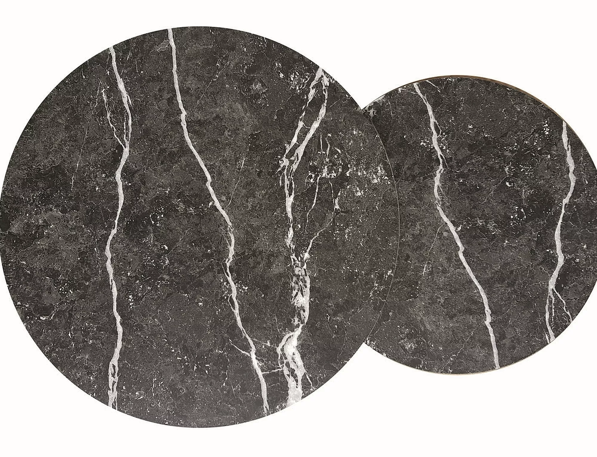 Zestaw ław, blat: płyta laminowana, stelaż: metal, kolor: czarny, efekt marmuru / złoty. Wymiary mniejszego stolika: średnica 48; wysokość: 42cm.