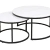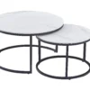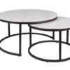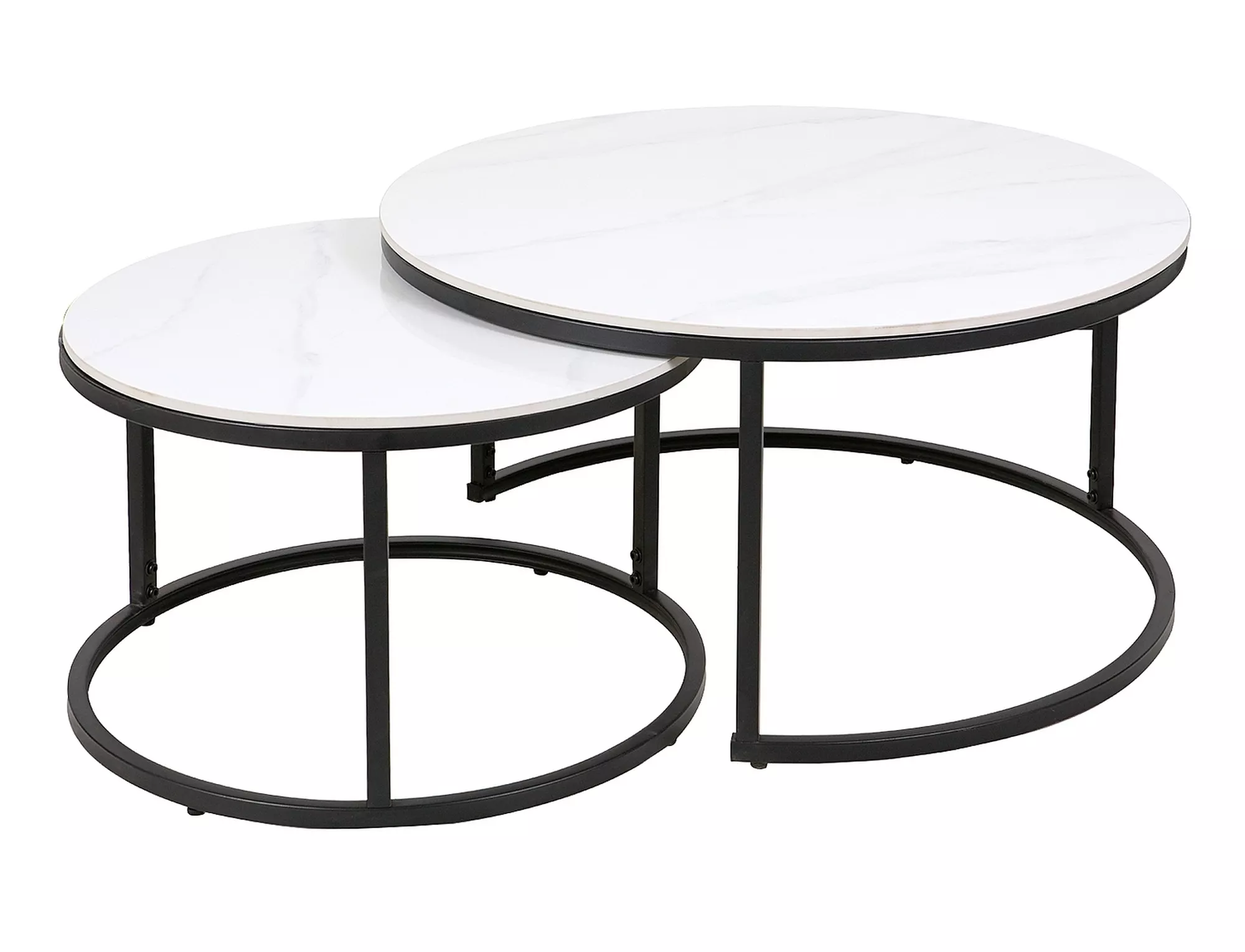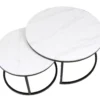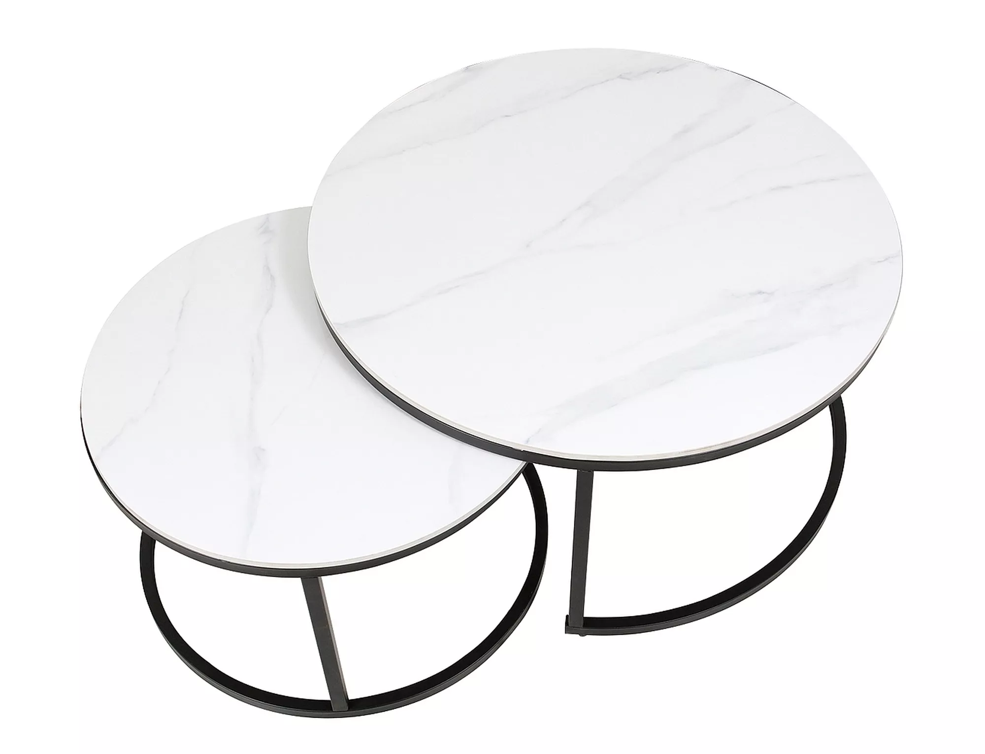 Zestaw ław, blat: ceramika, stelaż: metal, kolor: biały, efekt marmuru / czarny mat. Wymiary mniejszego stolika: średnica 60; wysokość: 38cm.