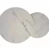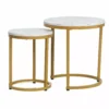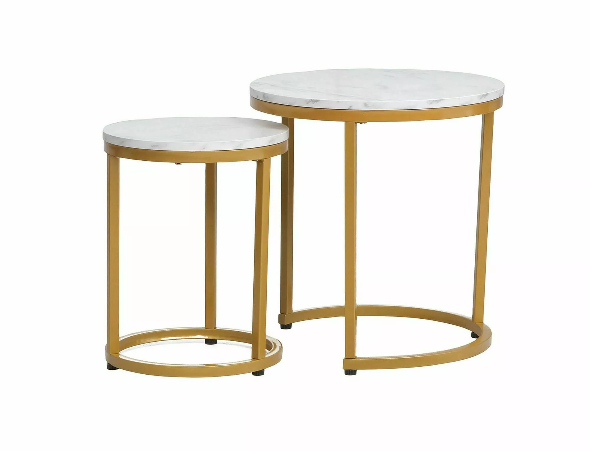 Zestaw ław, blat: płyta laminowana, stelaż: metal, kolor: biały, efekt marmuru / złoty. Wymiary mniejszego stolika: średnica 32; wysokość: 42cm.