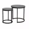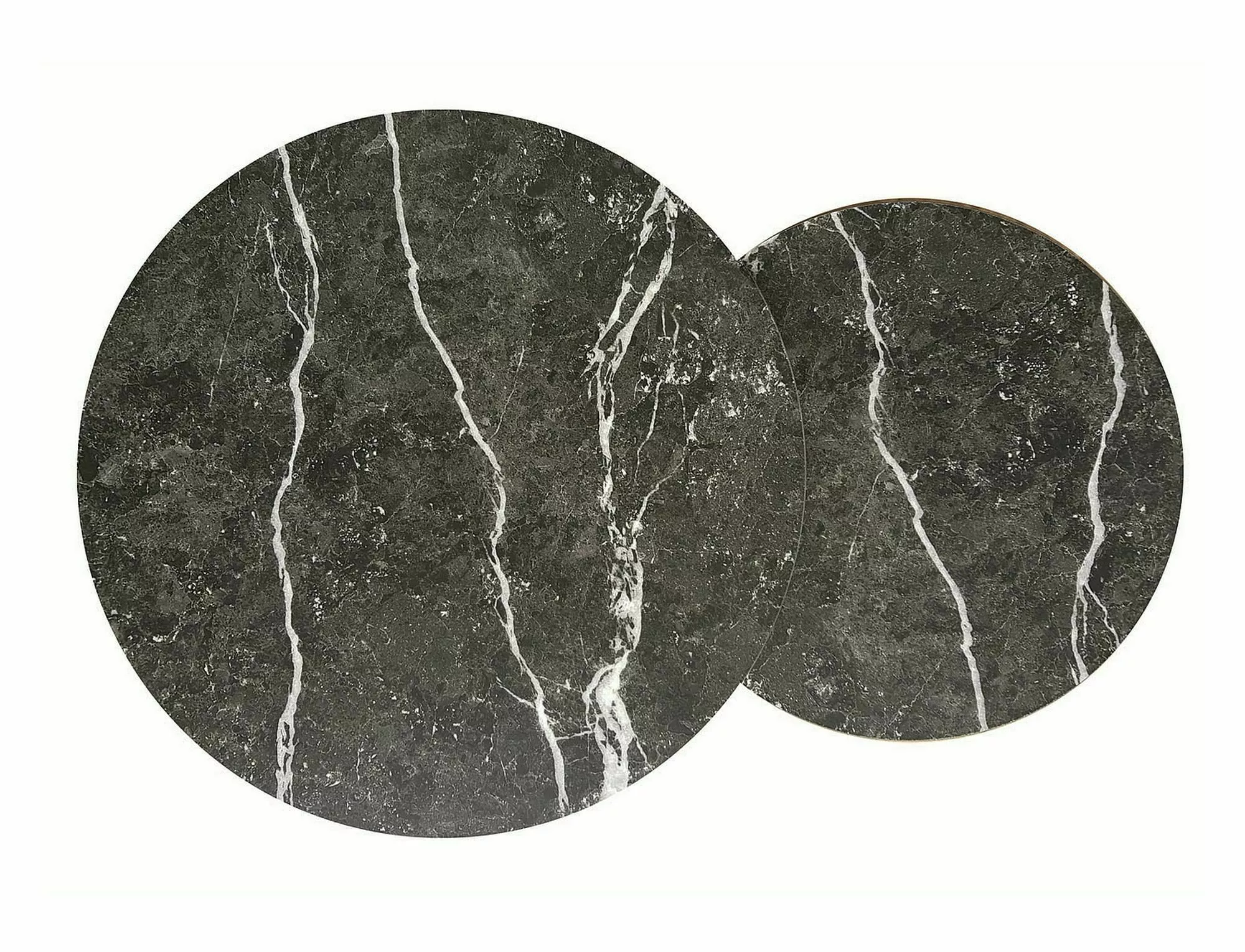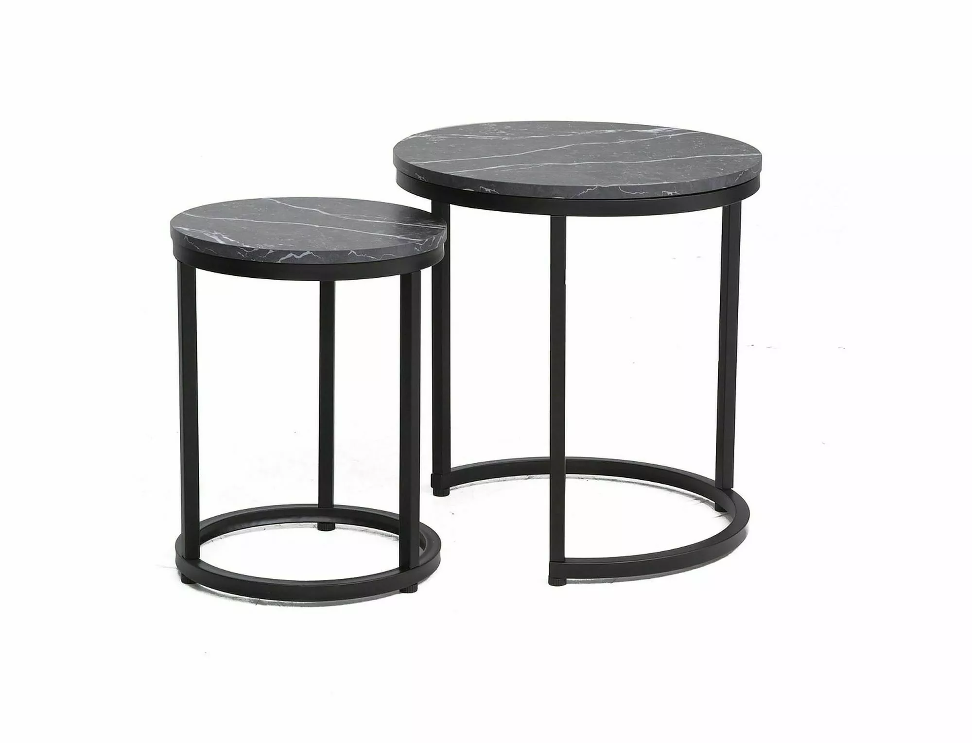 Zestaw ław, blat: płyta laminowana, stelaż: metal, kolor: czarny, efekt marmuru / czarny mat. Wymiary mniejszego stolika: średnica 32; wysokość: 42cm.