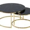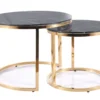 Zestaw ław, blat: szkło hartowane, stelaż: stal nierdzewna, kolor: czarny, efekt marmuru / złoty. Wymiary mniejszego stolika: średnica 60; wysokość: 40cm.