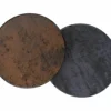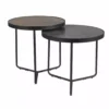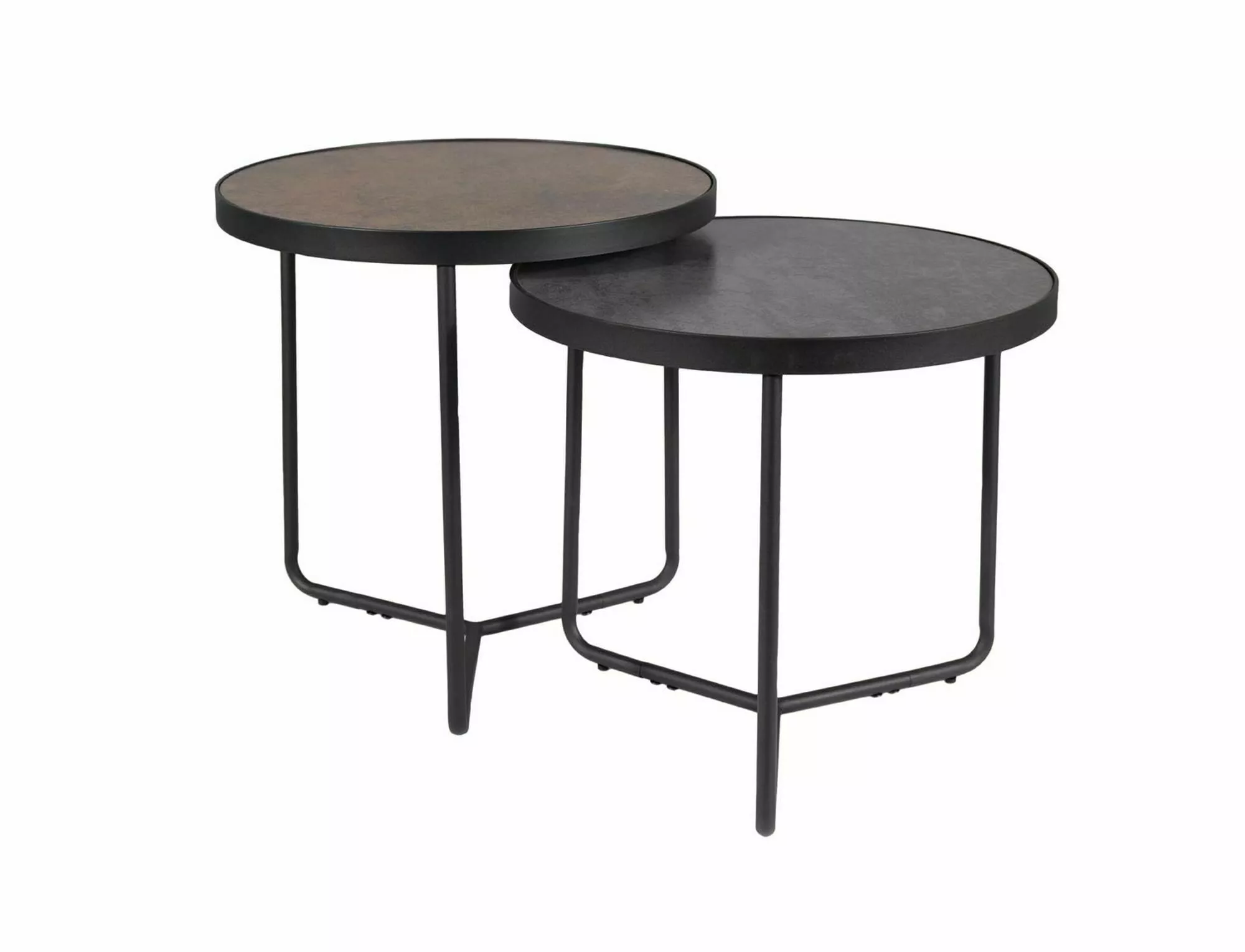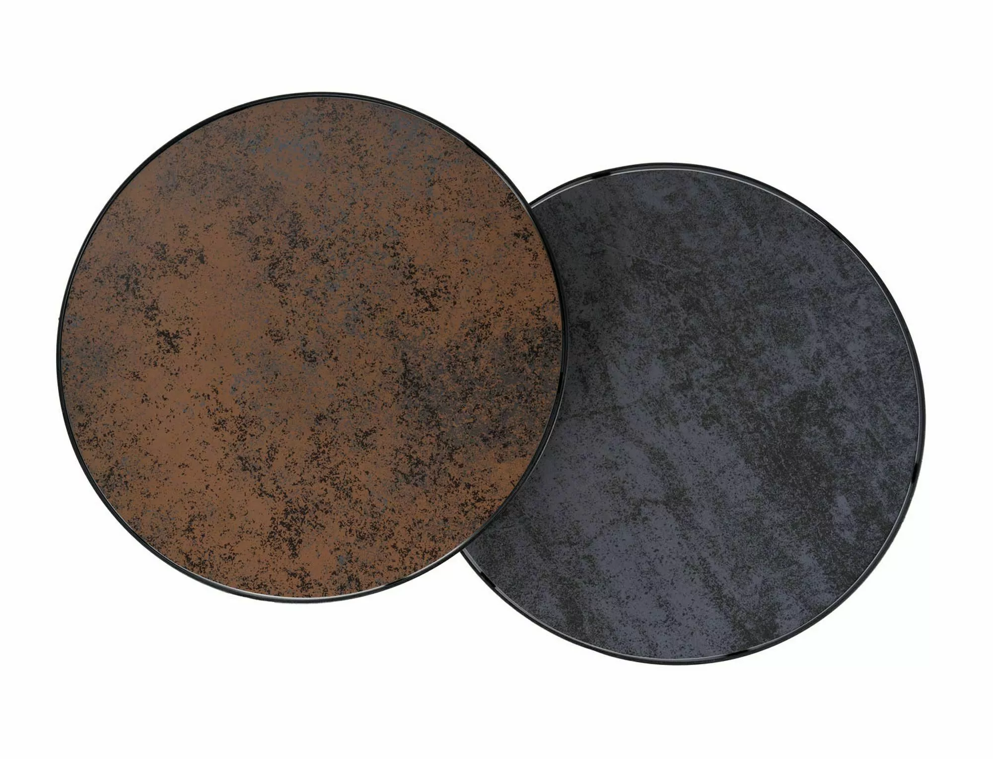 Zestaw ław, blat: szkło hartowane z efektem kamienia, stelaż: metal, kolor: brąz + szary / czarny. Wymiary mniejszego stolika: średnica – 50cm, wysokość – 45 cm.