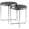 Zestaw ław, blat: szkło hartowane, stelaż: metal, kolor: czarny / chrom. Wymiary mniejszego stolika fi: 40, h-45 cm.