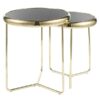 Zestaw ław, blat: szkło hartowane, stelaż: metal, kolor: czarny / złoty. Wymiary mniejszego stolika fi: 40, h-45 cm.
