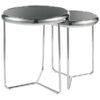 Zestaw ław, blat: szkło hartowane, stelaż: metal, kolor: czarny / chrom. Wymiary mniejszego stolika fi: 40, h-45 cm.