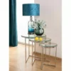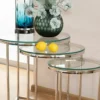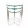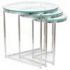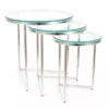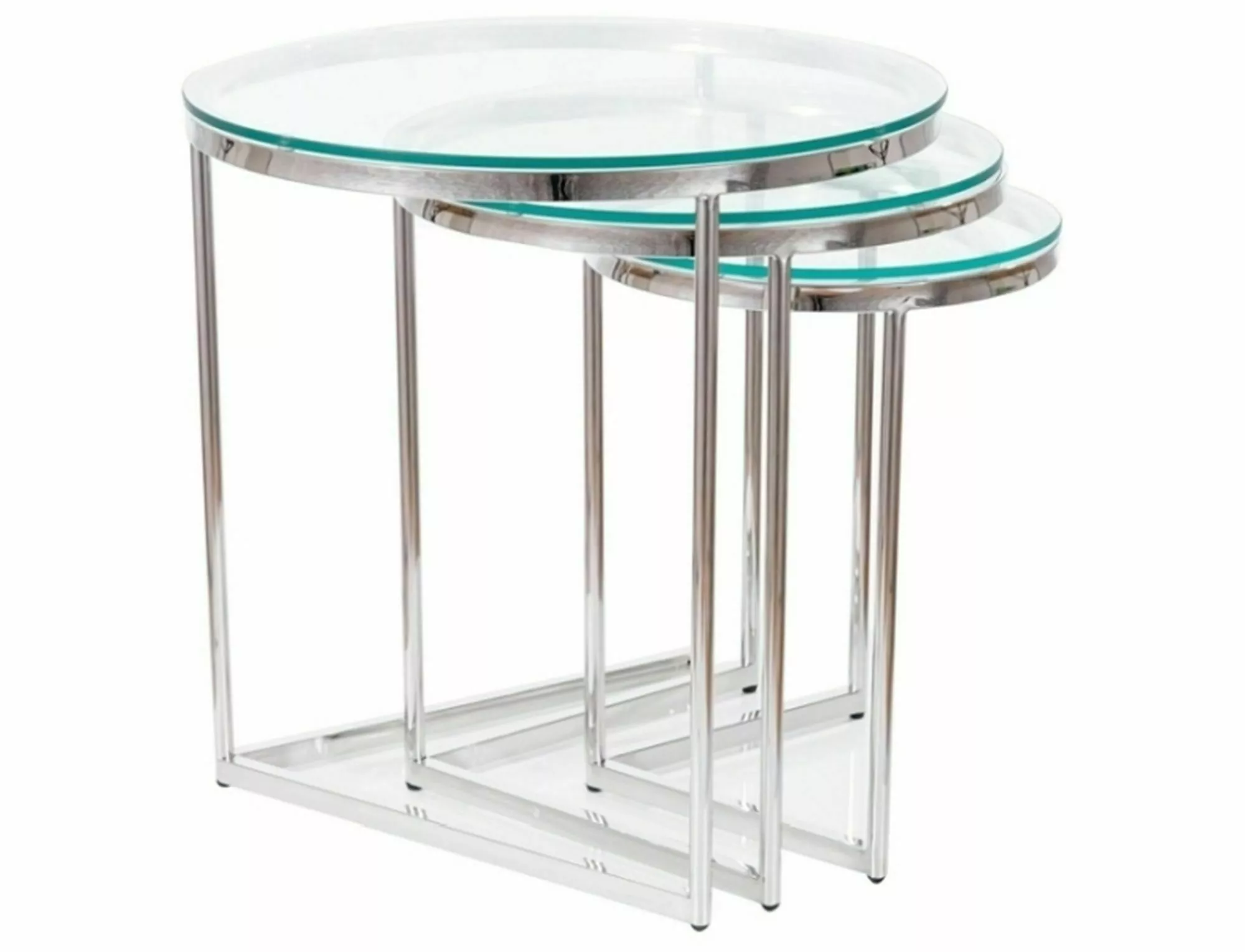 Zestaw ław, blat: szkło hartowane transparentne, stelaż: stal nierdzewna, kolor: srebrny. Wymiary mniejszych stolików: fi-35xh-46, fi-45xh-51 cm.
