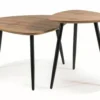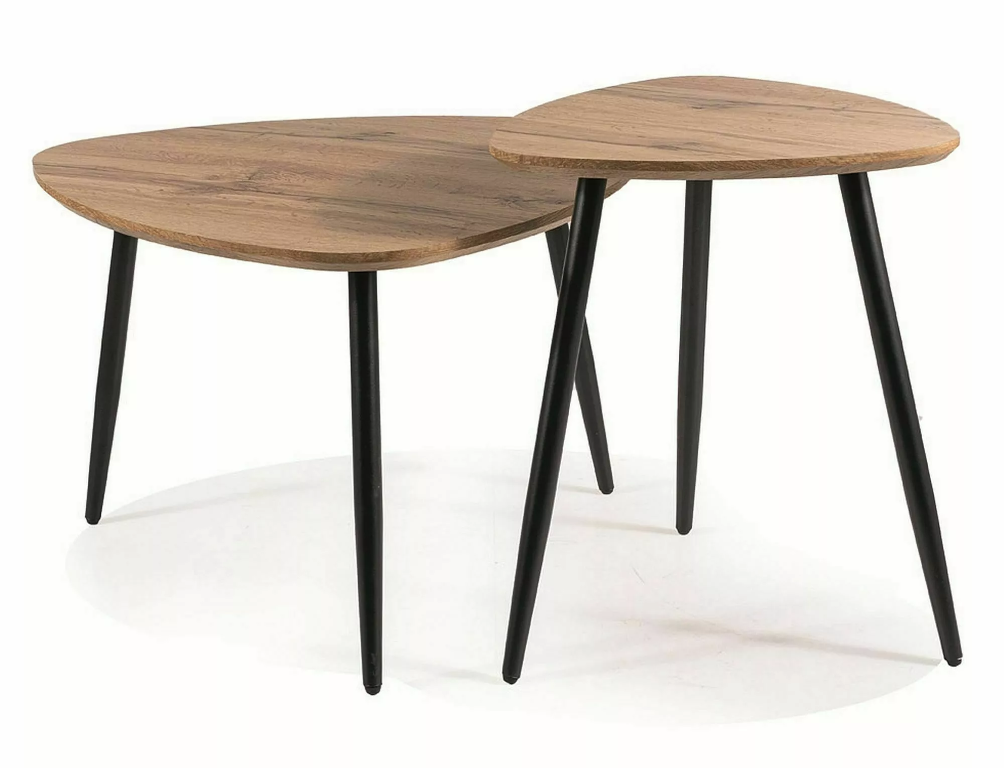 Zestaw ław, blat: MDF + okleina, stelaż: metal, kolor: dąb artisan / czarny mat. Wymiary mniejszego stolika: szerokość 40; wysokość: 48 cm.